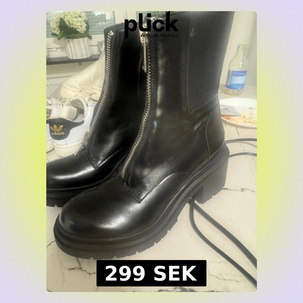 Säljer ett par svarta boots i skinn med chunky klack och grov platt sula. De har en rejäl dragkedja framtill och ribbad stretchpanel på sidan för extra komfort. Snygg rund tå och stilren look som passar till många outfits.