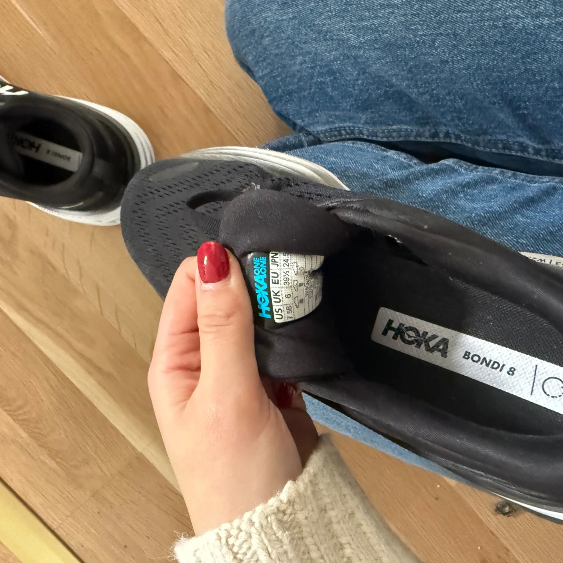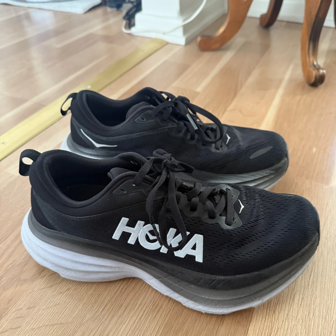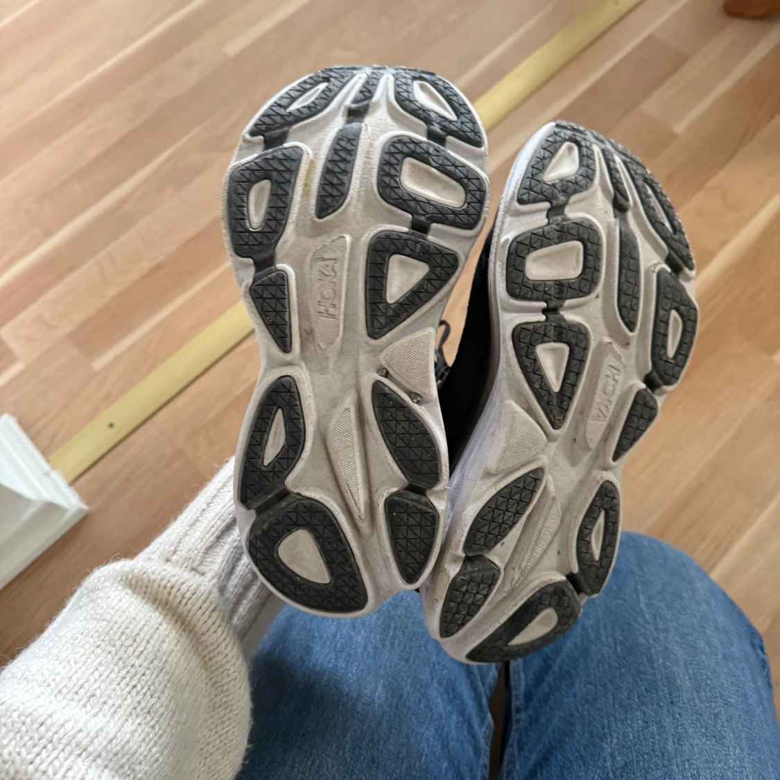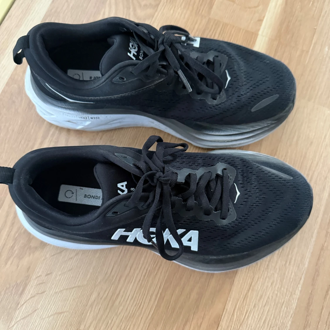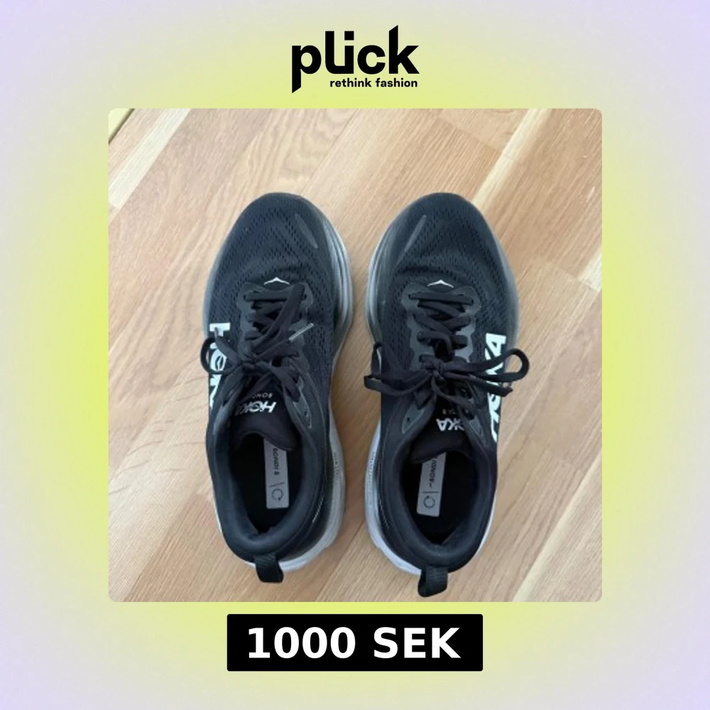 Säljer ett par svarta Hoka Bondi 8 sneakers med vit och grå tjock sula. Skorna har ventilerande mesh-ovandel, snörning och Hoka-logga på sidan. Strl 39 1/3. Använd endast 2 ggr
