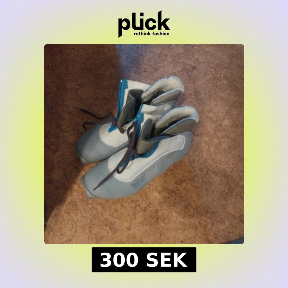 Säljer ett par grå och vita vinterkängor från Salomon med blå detaljer. Skorna har snörning och är fodrade med mjuk päls för extra värme. Perfekta för kalla dagar och vinteraktiviteter. Snygg design med Salomon-logga på sidan.