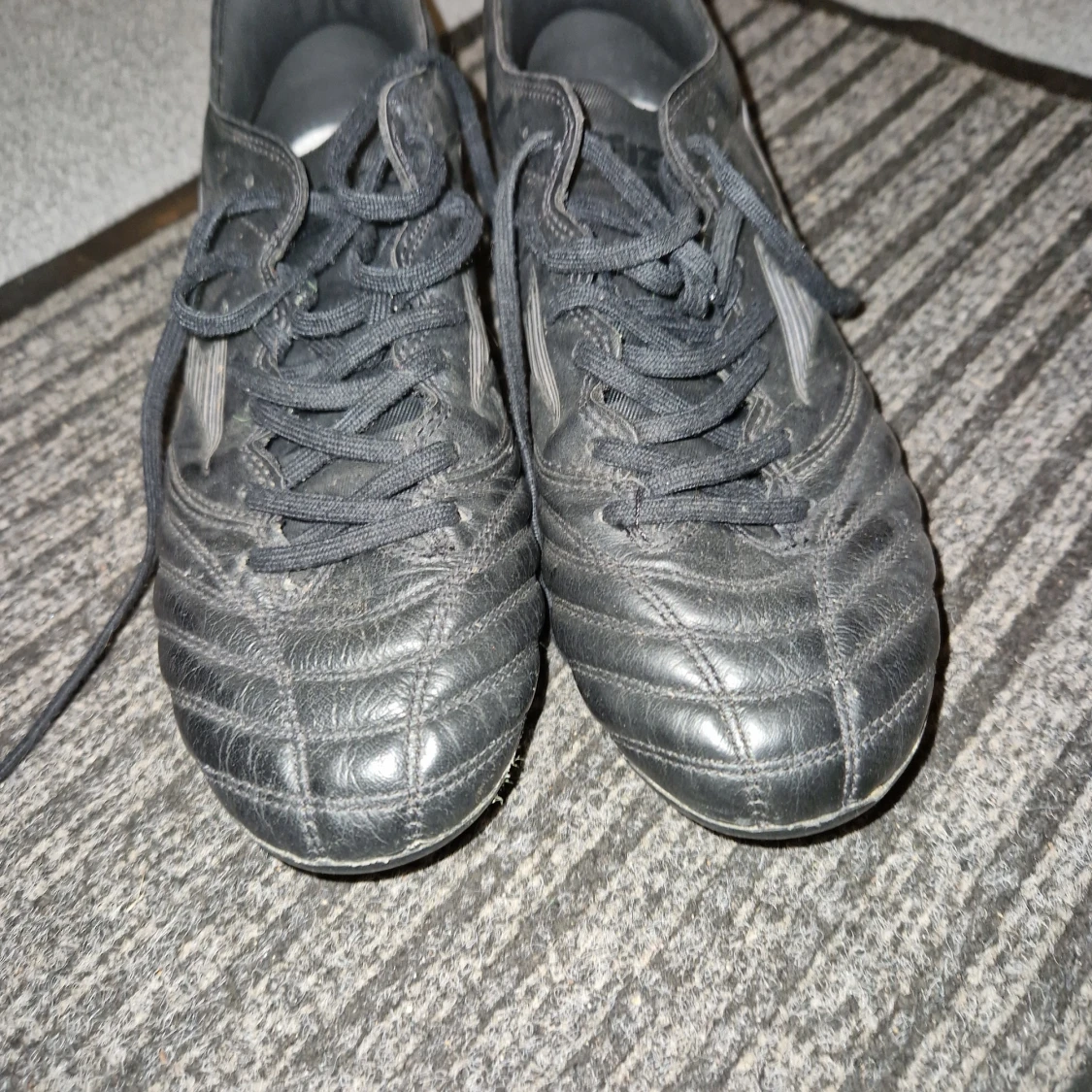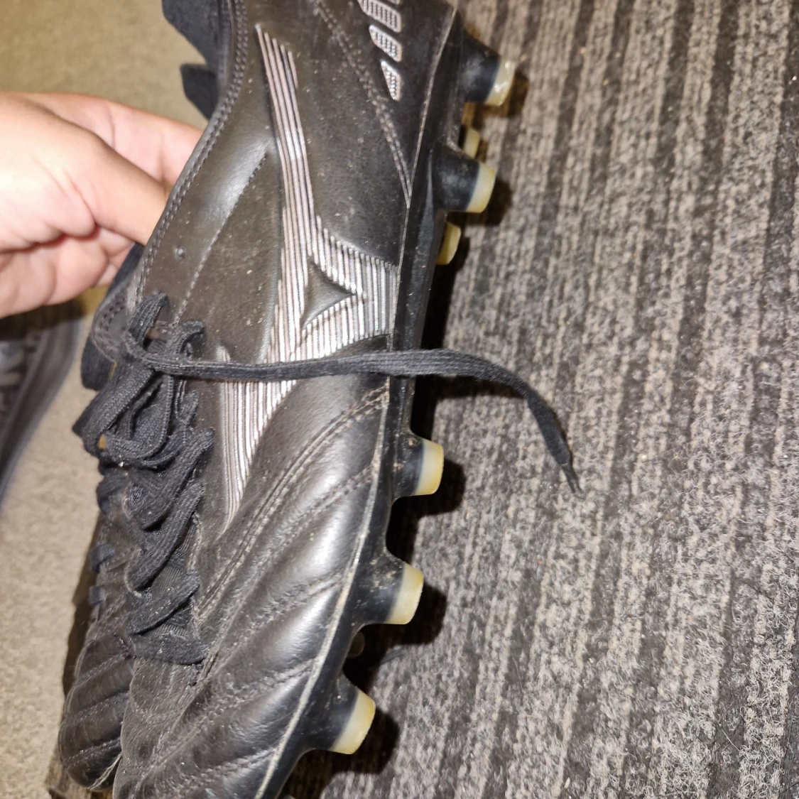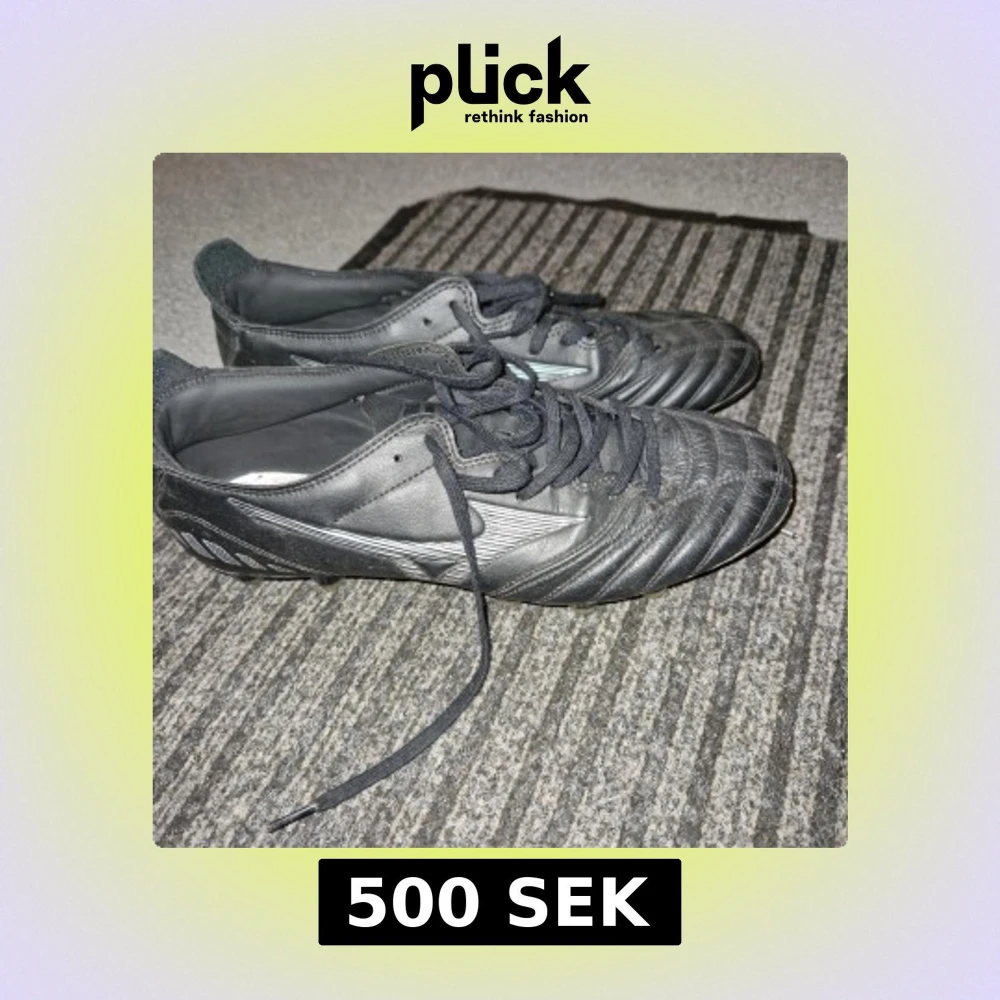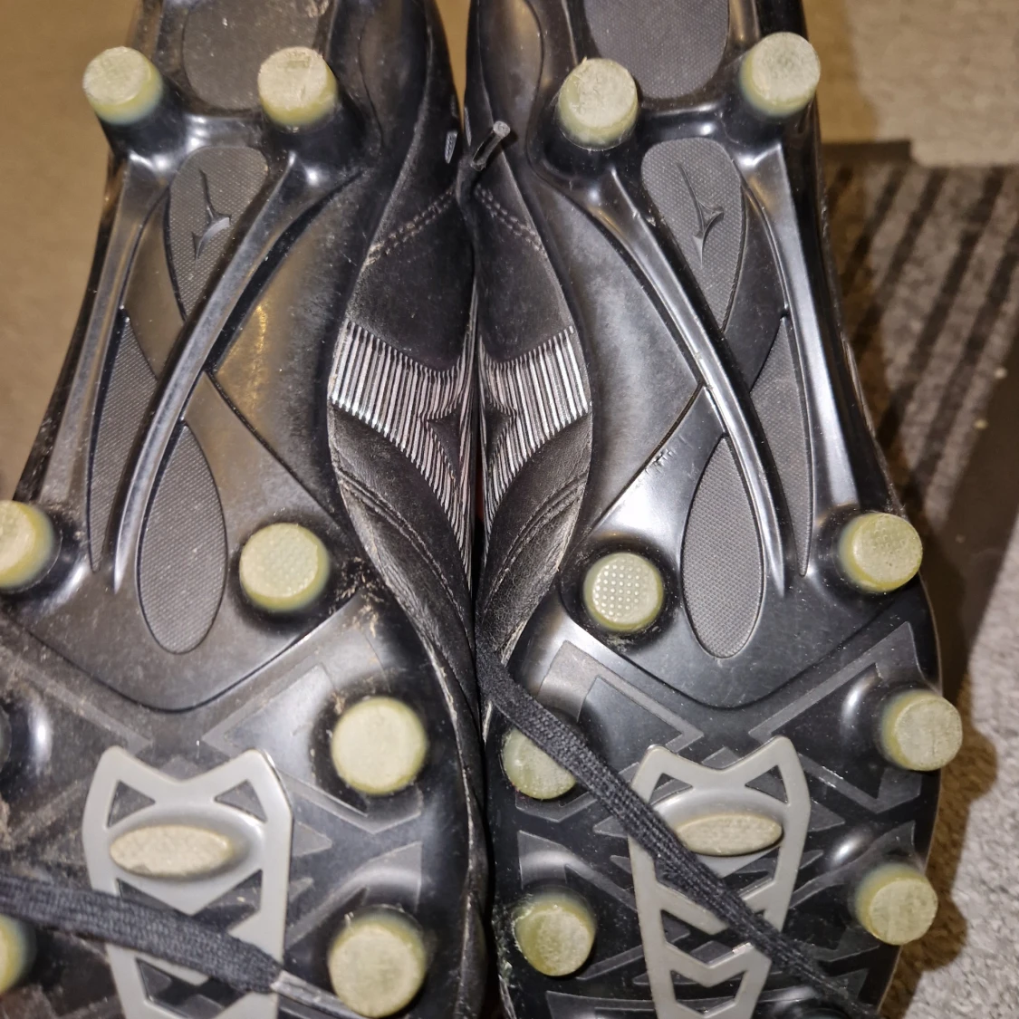 Säljer ett par svarta fotbollsskor från Mizuno med klassisk design och vita detaljer på sidorna. Skorna har snörning och rund tå samt fasta dobbar för spel på gräs. Perfekta för dig som vill ha stilrena och funktionella skor på planen.
