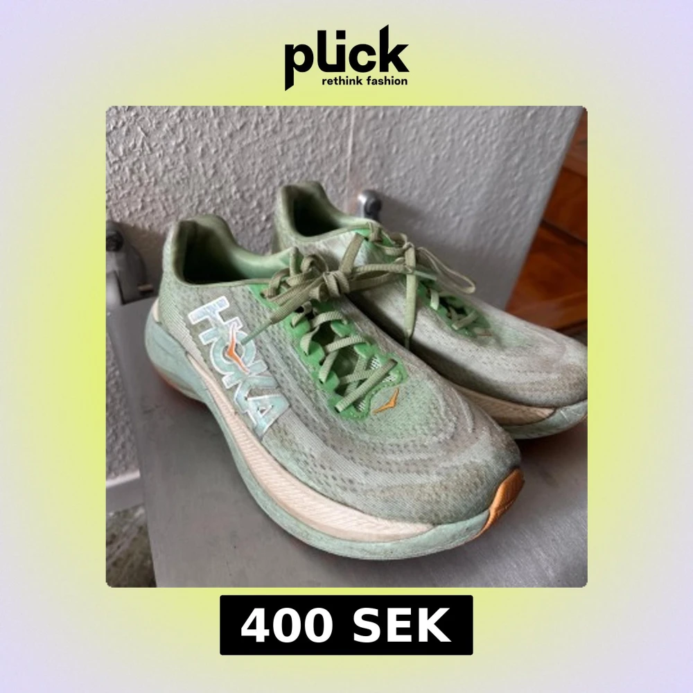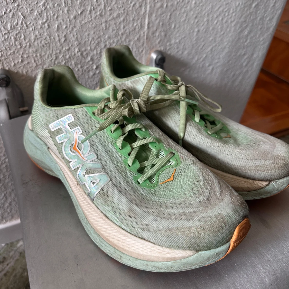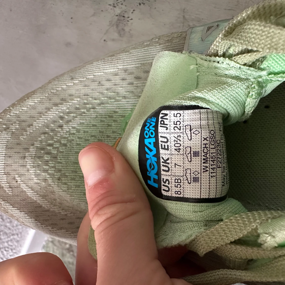 Säljer ett par Hoka One One Mach X sneakers i ljusgrönt med vita och orange detaljer. Skorna har snörning, rund tå och en tjock, dämpad sula som passar perfekt för löpning eller träning. Ovandelen är i syntetmaterial för bra andningsförmåga. Använda men i fint skick.