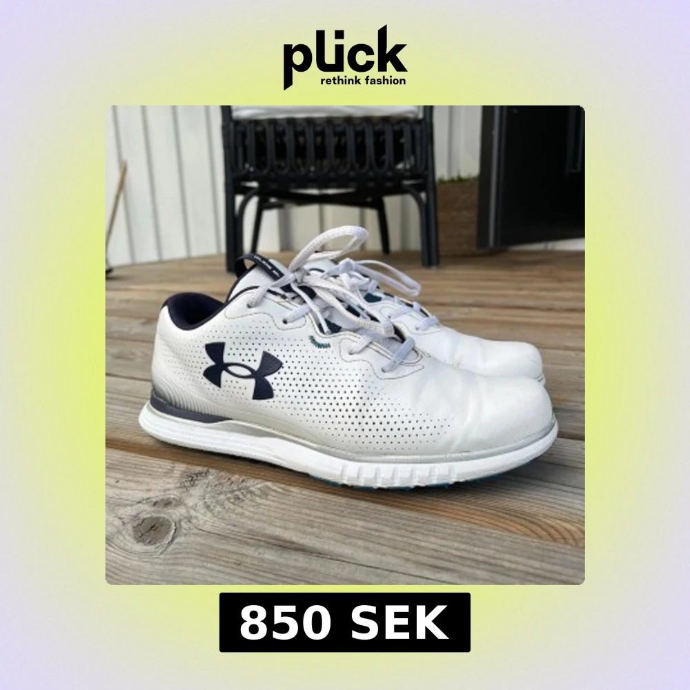 Snygga vita golfskor från Under Armour med marinblå detaljer och logga på sidan. Skorna har perforerat mönster för extra ventilation, snörning och en platt sula. Ovandelen är i syntetmaterial och insidan är vadderad för skön komfort. Bra grepp under för just golf. Finns små slitningar men absolut inget betydande.