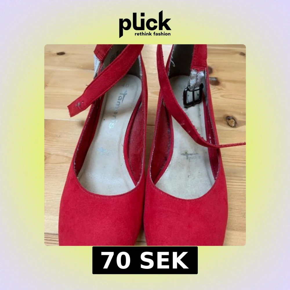 Snygga röda pumps i mocka från Tamaris med en bekväm klack och justerbart spänne. Lite slitna vid skärpet syns dock inte när man har på sig de