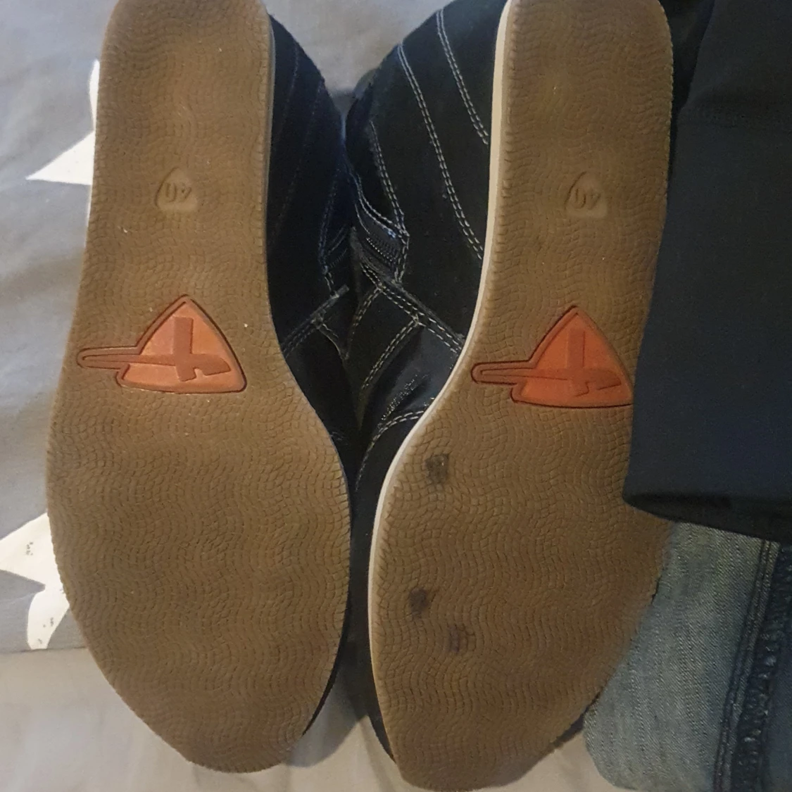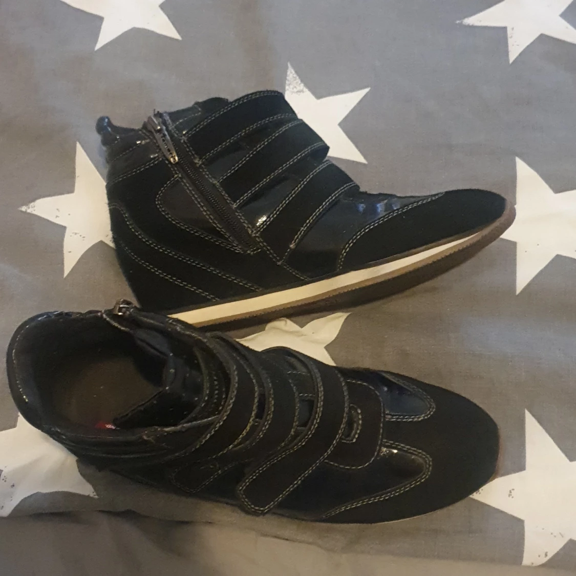 Snygga svarta sneakers från Tamaris med både dragkedja och kardborreband. Skorna har en blandning av blankt syntetmaterial och mockadetaljer, samt vit sula och dekorativa sömmar. Perfekta för dig som gillar en sportig och cool stil. Använda några gånger. 25.5 cm i innersula 16-17 cm höga.