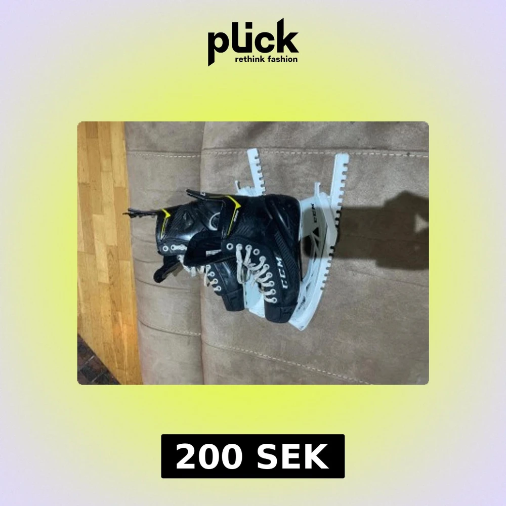 Säljer ett par svarta CCM hockeyskridskor modell 9366 med vita snören och Speedblade-stål. Skridskorna har detaljer i gult och vitt, högt skaft och robust konstruktion för extra stöd. Perfekt för dig som vill ha grymma skridskor på isen. Och skridskorskydd ingår
