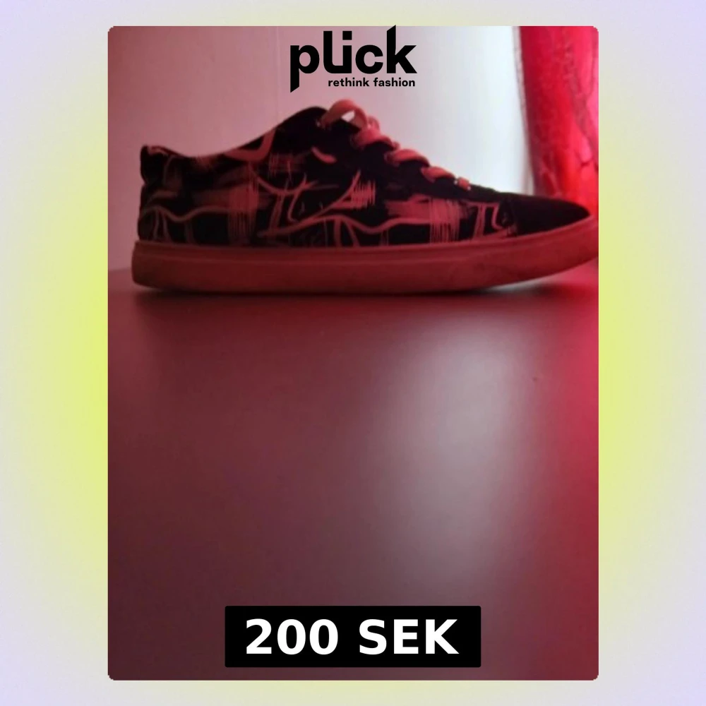 Säljer ett par svarta sneakers med vit grafisk print och vita snören. Skorna har rund tå, platt sula och coolt mönster som sticker ut. Perfekt för dig som gillar streetstyle och vill ha något unikt på fötterna.