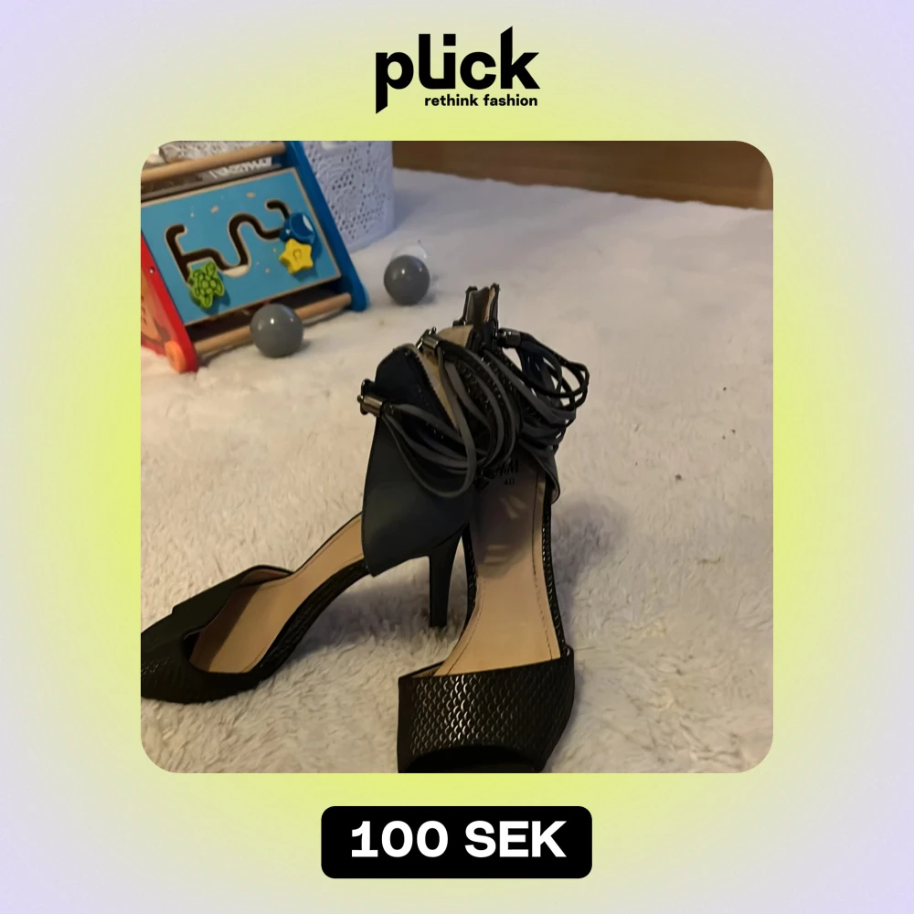 Snygga svarta klackskor med öppen tå och elegant snörning runt ankeln. Perfekta för festliga tillfällen. Skorna har en texturerad yta och en bekväm klackhöjd. De är i bra skick och redo för nästa ägare!