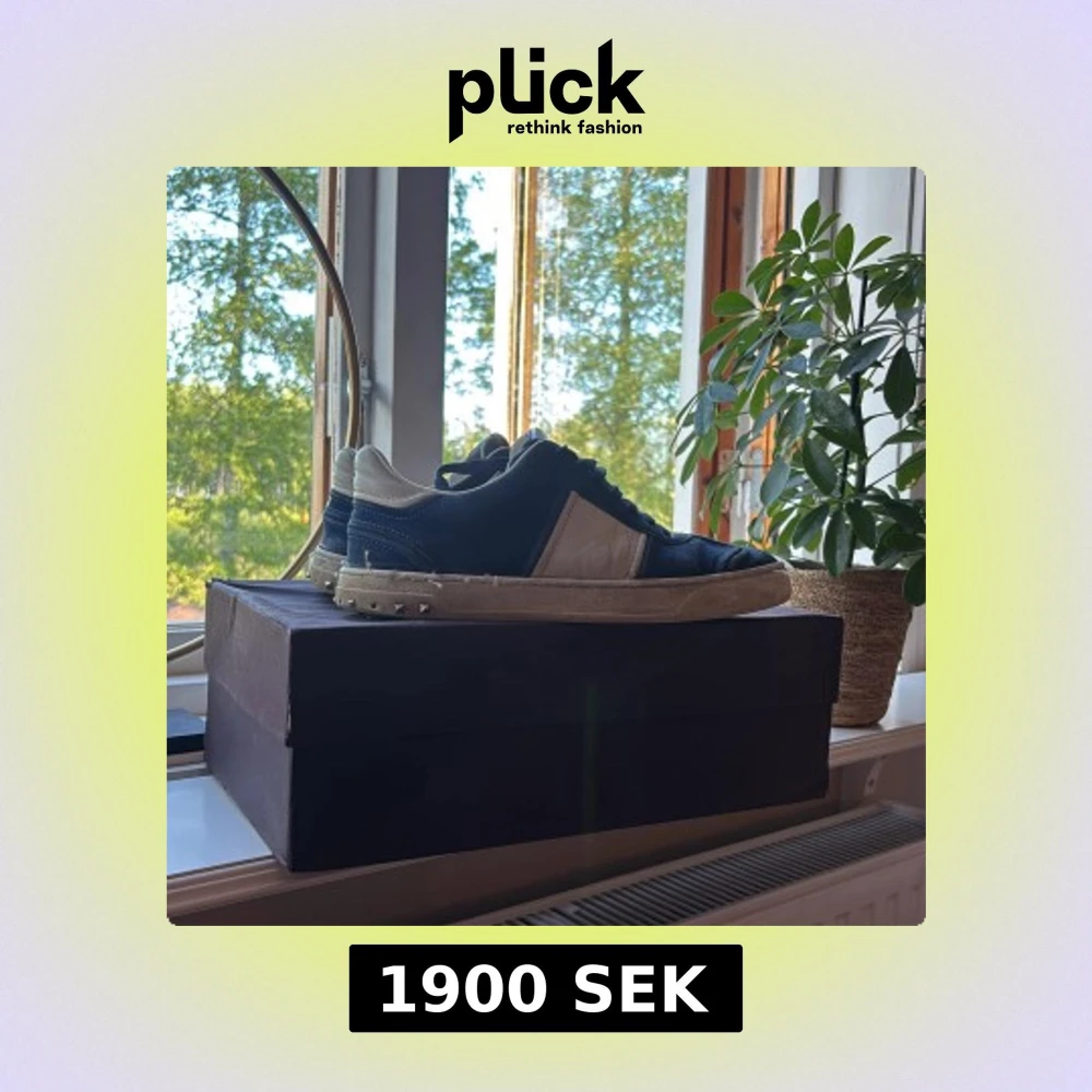 Säljer ett par blåa Valentino Garavani sneakers med vita detaljer och silverfärgade nitar vid hälen. Skorna har snörning och en platt sula. Kommer med originalkartong och dustbag.