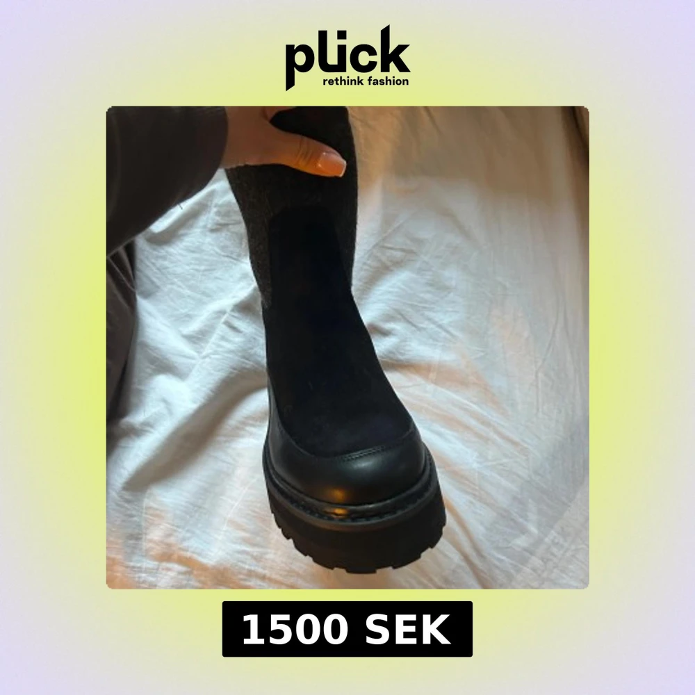Snygga svarta boots från Mono med en robust sula och stilren design. Skorna har en kombination av skinn och ullmaterial, vilket ger en elegant och varm känsla. Perfekta för kyligare dagar. De är helt nya, aldrig använda och kommer med skokartong. Nypris är 3 299kr
