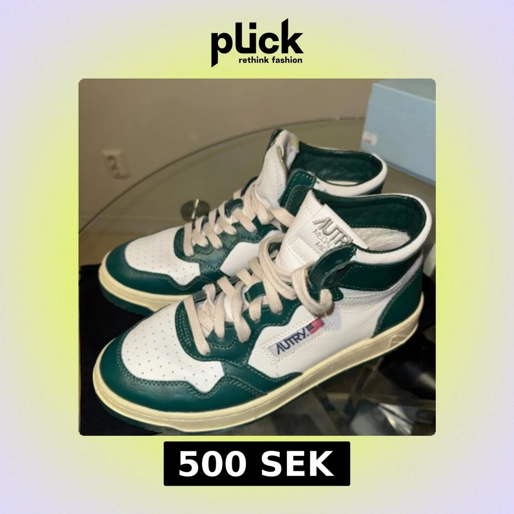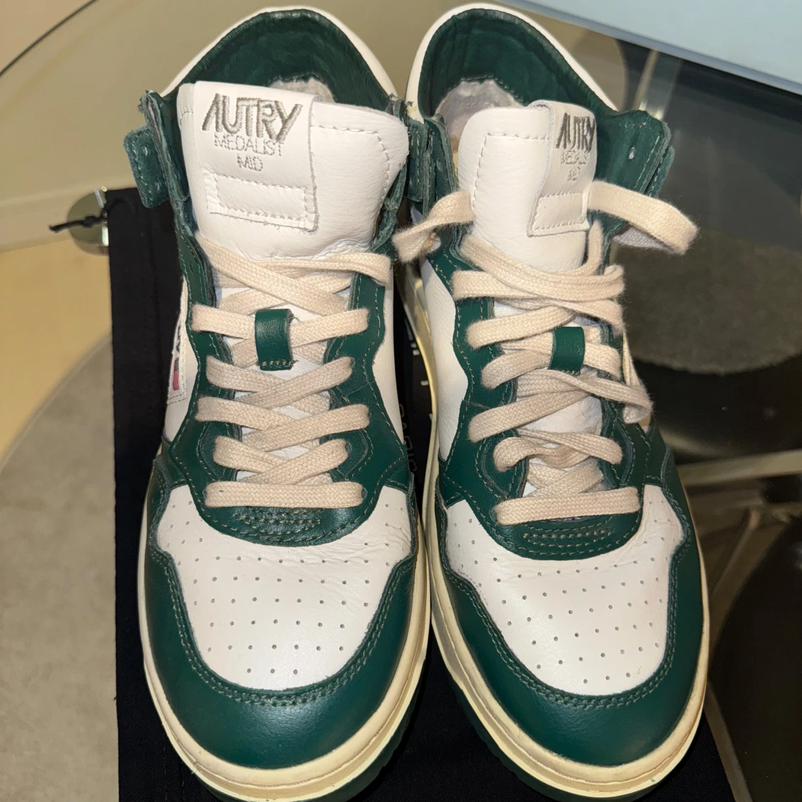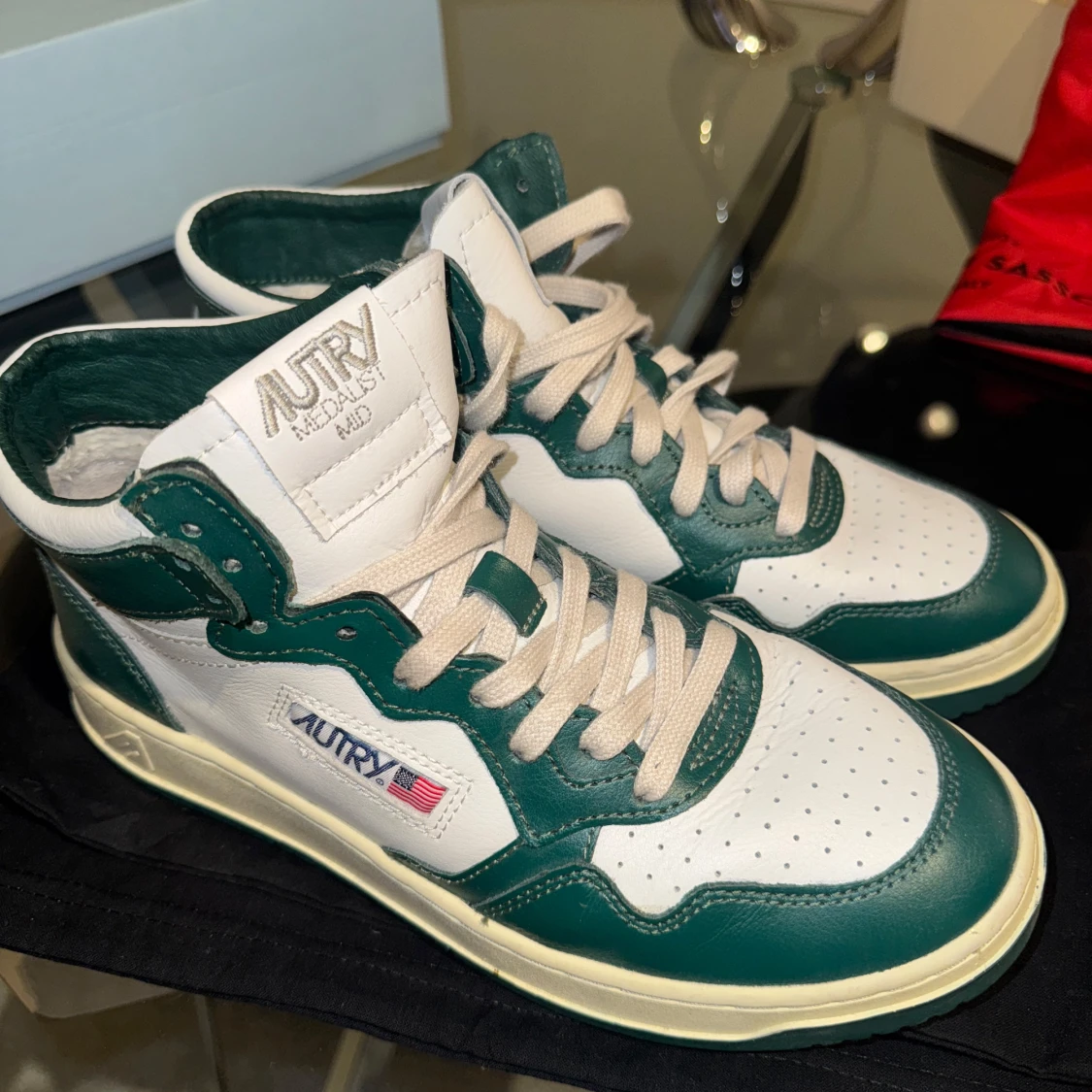Säljer ett par Autry Medalist Mid sneakers i vitt och grönt. Skorna har högt skaft, snörning och perforerad tå för extra ventilation. Klassisk retrostil med märkets logga och amerikanska flaggan på sidan. Perfekta för dig som gillar streetwear.