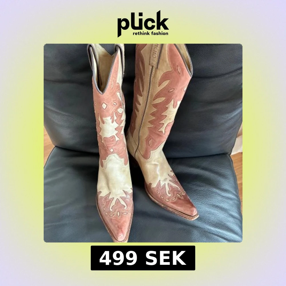 Säljer ett par handgjorda Sancho cowboy boots i beige och brun skinn med snygga broderade detaljer och spetsig tå. Boots med hög klack och klassiskt westernmönster, tillverkade i Spanien. Perfekta för dig som vill sticka ut med en unik stil.