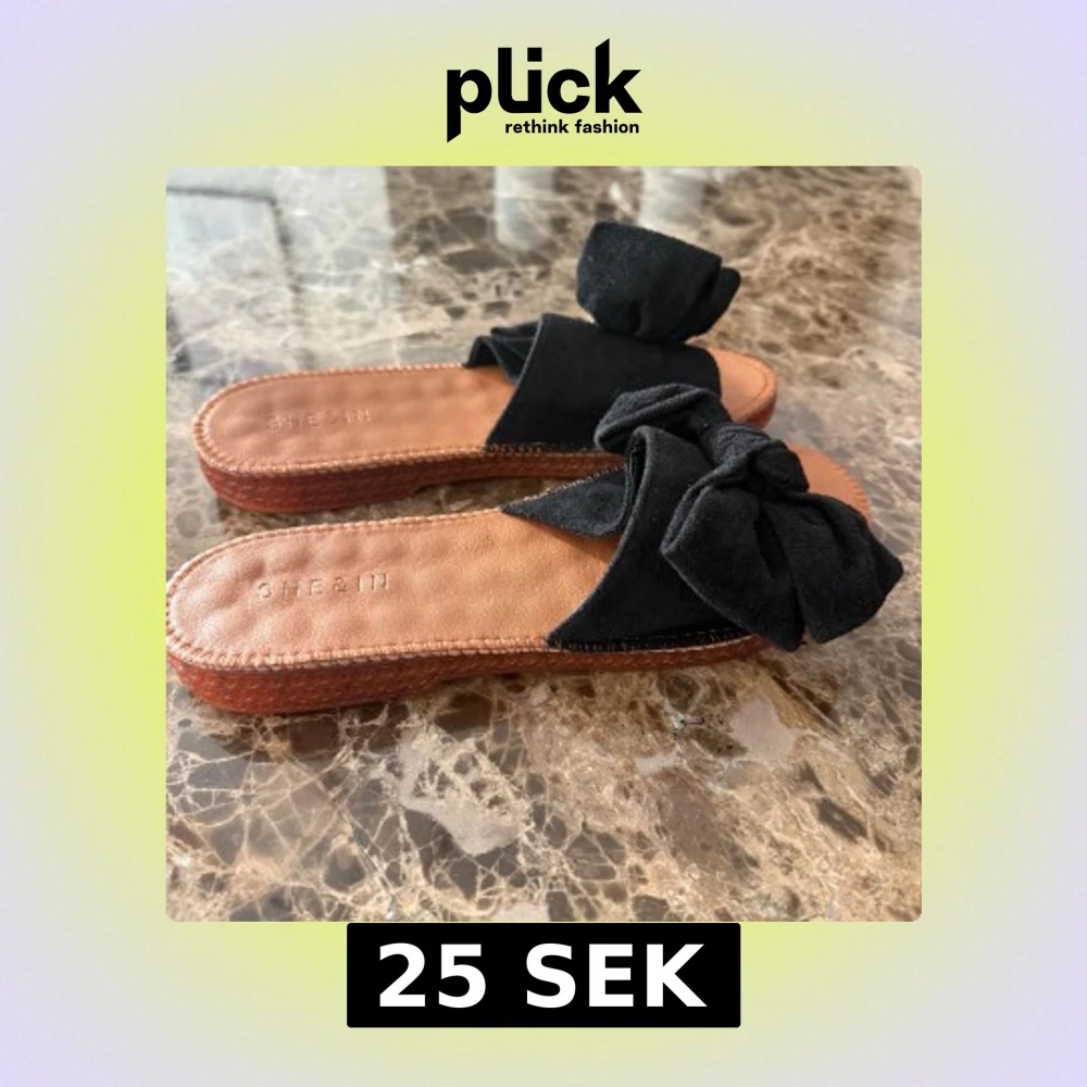 Snygga sandaler från SHEIN med svart ovandel i mockaliknande material och stor rosett som detalj. Sulan är brun och platt, perfekt för varma dagar. Enkla att matcha till sommarens outfits.