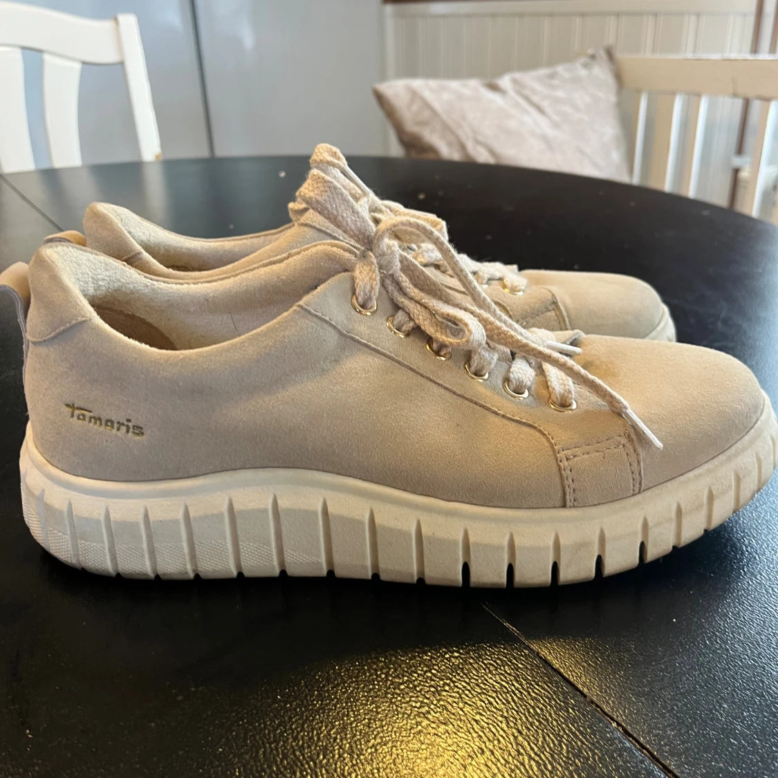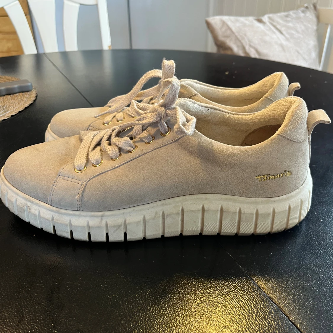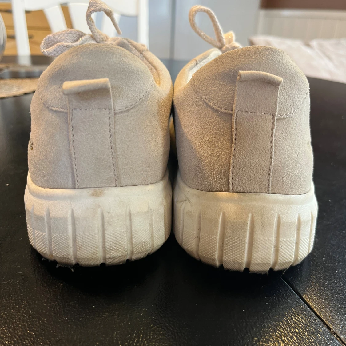Snygga beige sneakers med chunky vit sula och ovandel i mjuk mocka. Skorna har rund tå, snörning med grova grå (och glittriga) skosnören och guldfärgade öljetter. Perfekta för dig som gillar en clean och stilren look med lite extra höjd i sulan.Använda några gånger och har ett litet märke på vänster sko men inget som märks