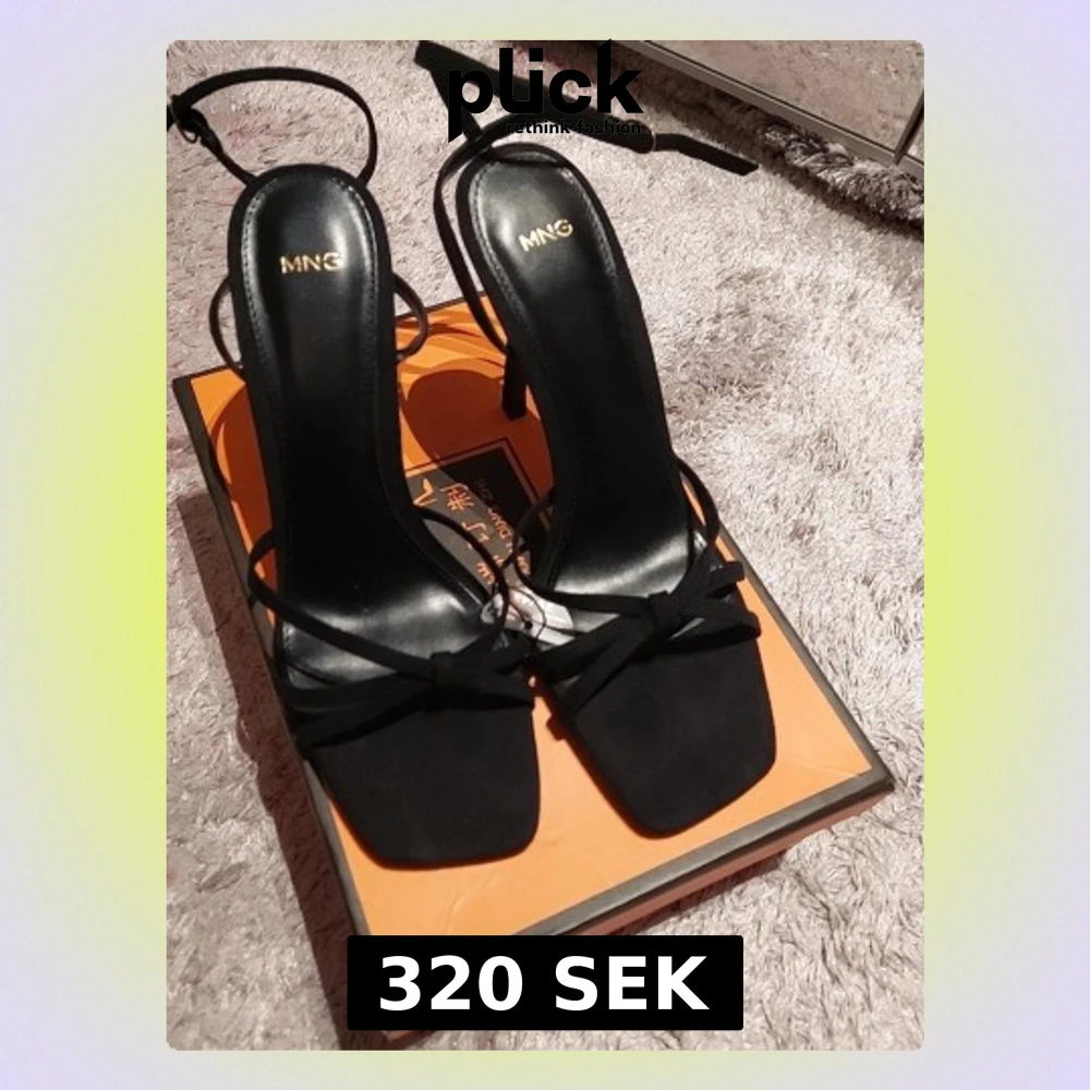 Snygga svarta sandaler från MNG med smala remmar och rosett framtill. Skorna har fyrkantig tå, hög klack och ankelsnörning. Materialet är en mix av skinn och mocka vilket ger en lyxig känsla. Perfekt för dig som gillar stilrena och trendiga skor.