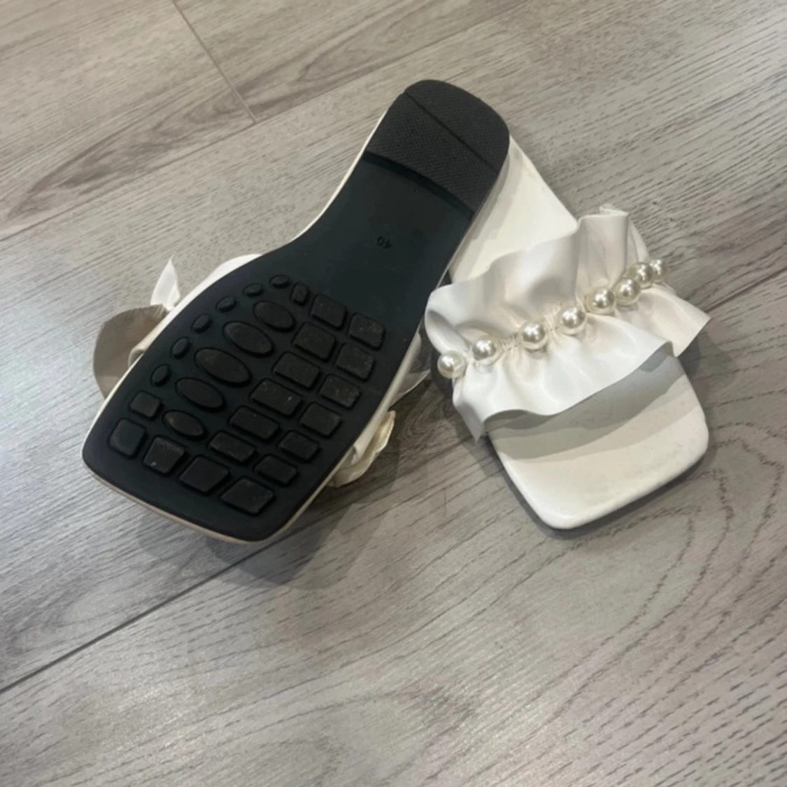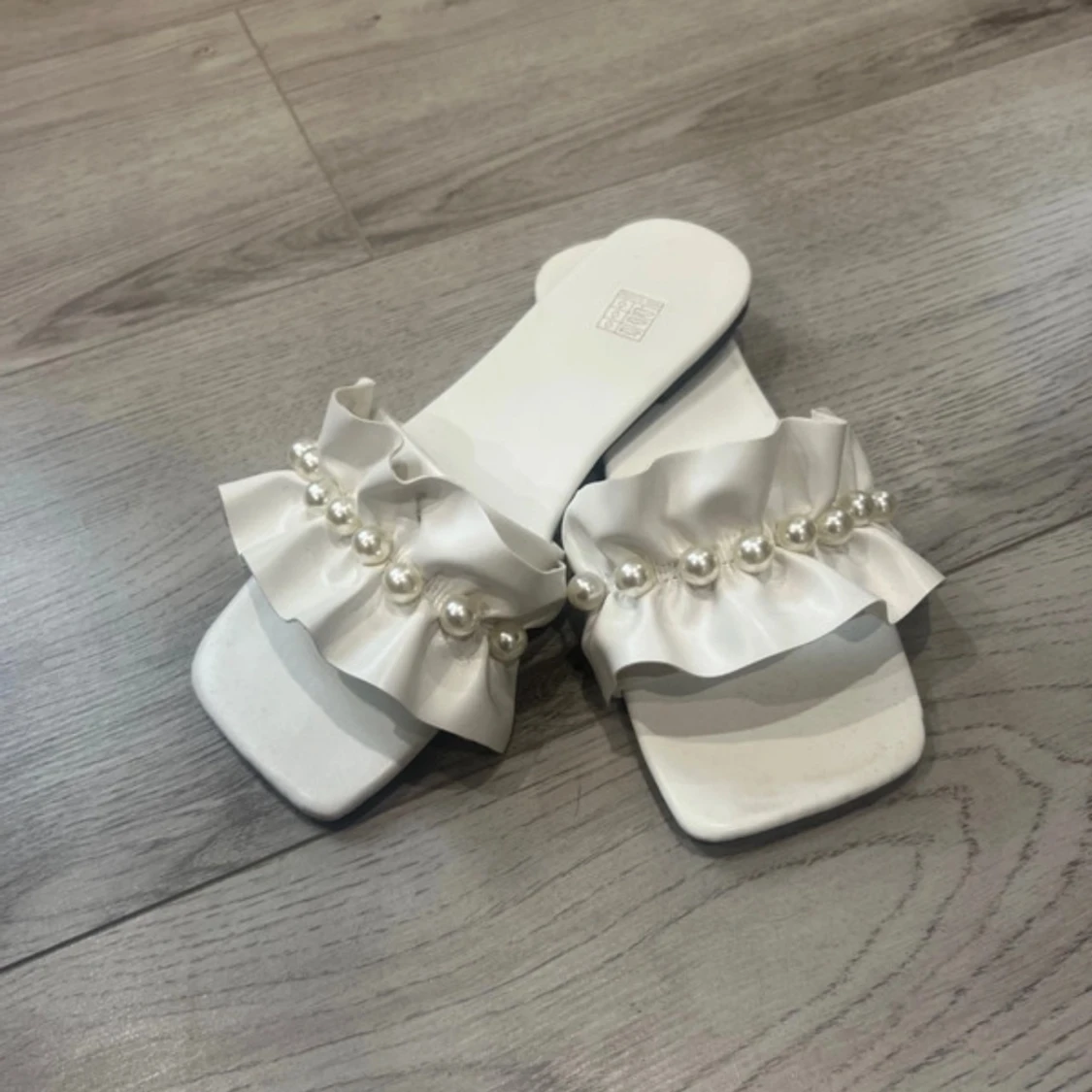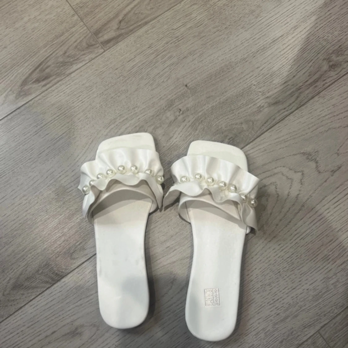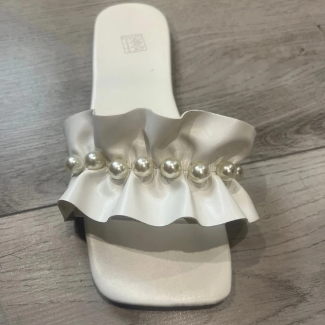 Eleganta vita sandaler med volang och pärldetaljer. Perfekta för en stilren look. Sandalerna har en fyrkantig tå och en platt sula för bekväm passform.