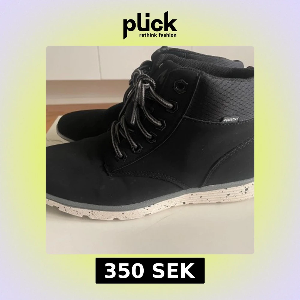 Svarta boots från Aquamax med snyggt mönstrad vit sula och svarta detaljer. Skorna har snörning med gråsvarta skosnören och en robust, mönstrad yttersula för extra grepp. Ovandelen är i syntetmaterial och skon har en sportig, modern look.