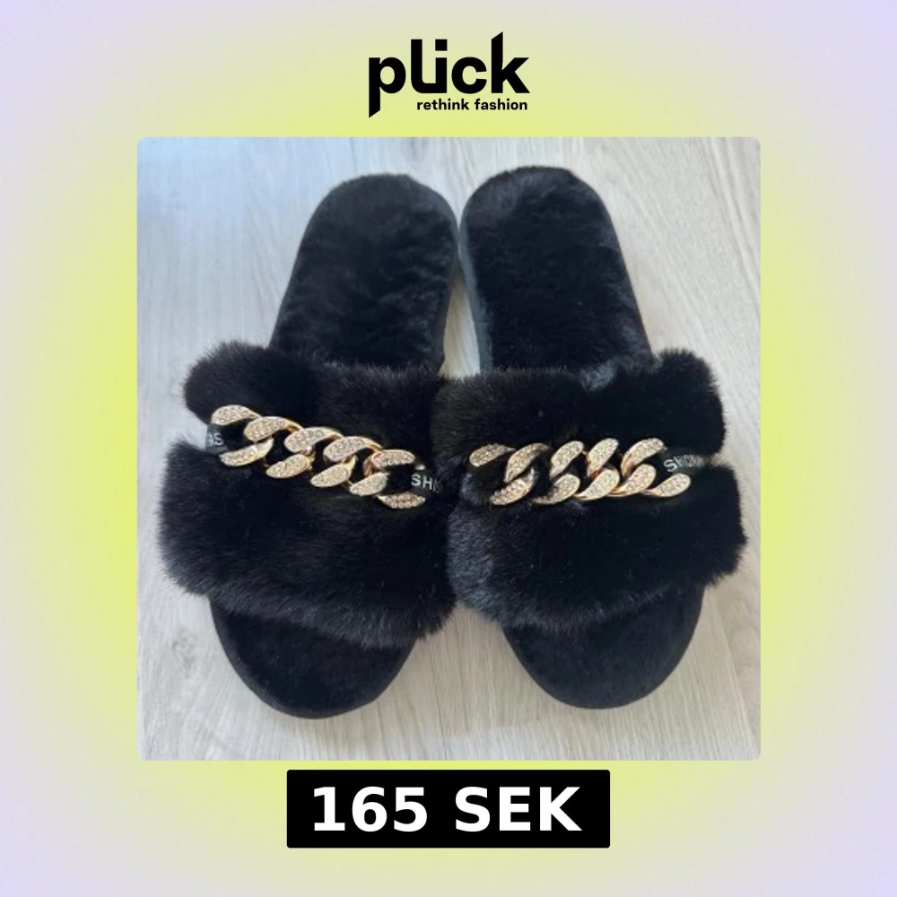 Säljer ett par svarta sandaler med mjuk, fluffig päls och en glittrig guldfärgad kedjedetalj över foten. Perfekta för att ge din outfit en lyxig touch. Snygga och trendiga att bära både hemma och ute. Det passar storlek 40-41 Det är helt nya och aldrig använda. Kan säljas för 150 kr vid snabb affär.