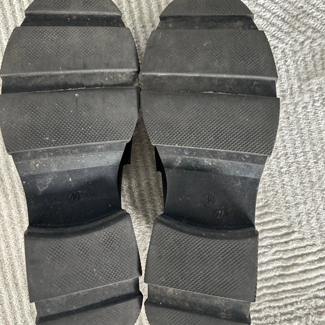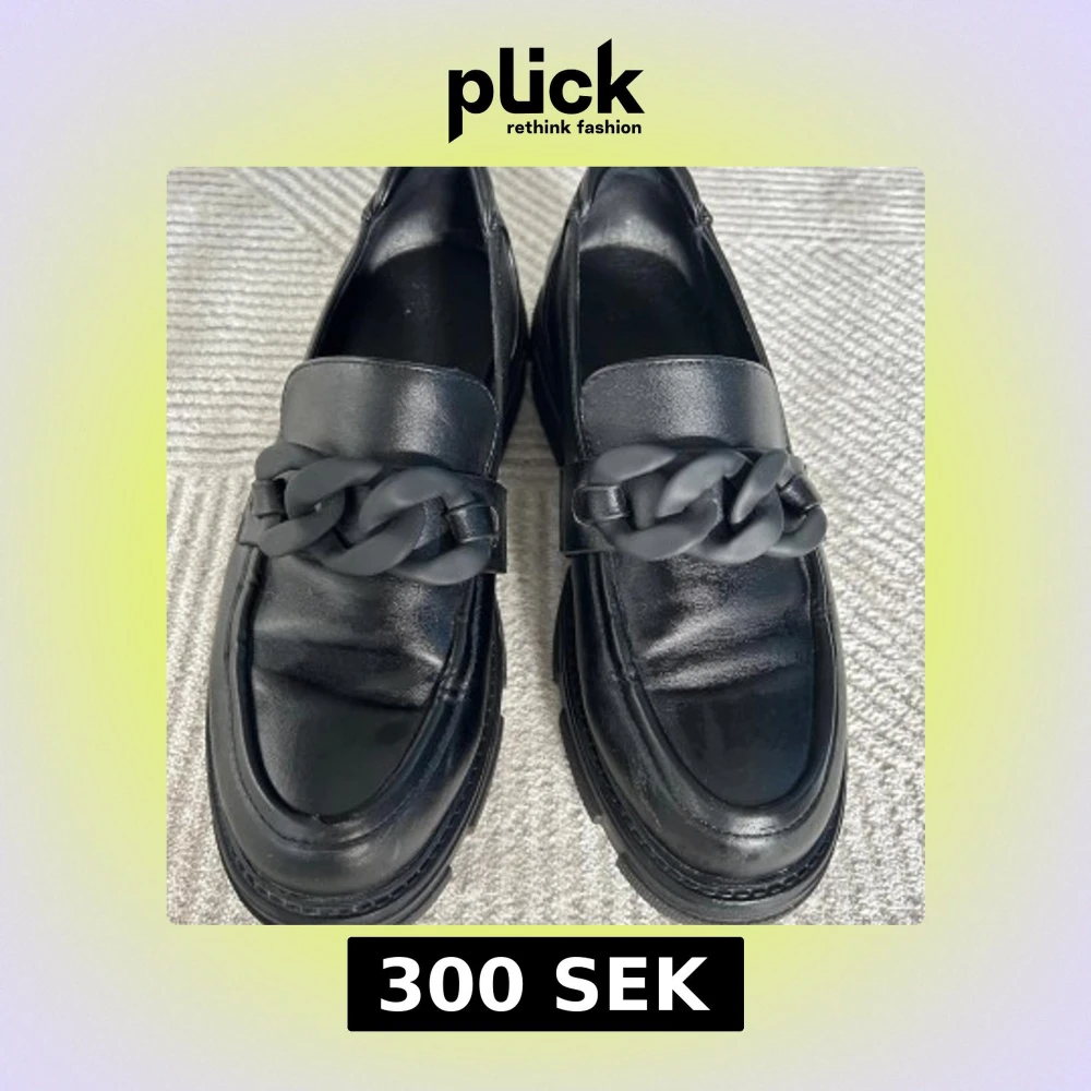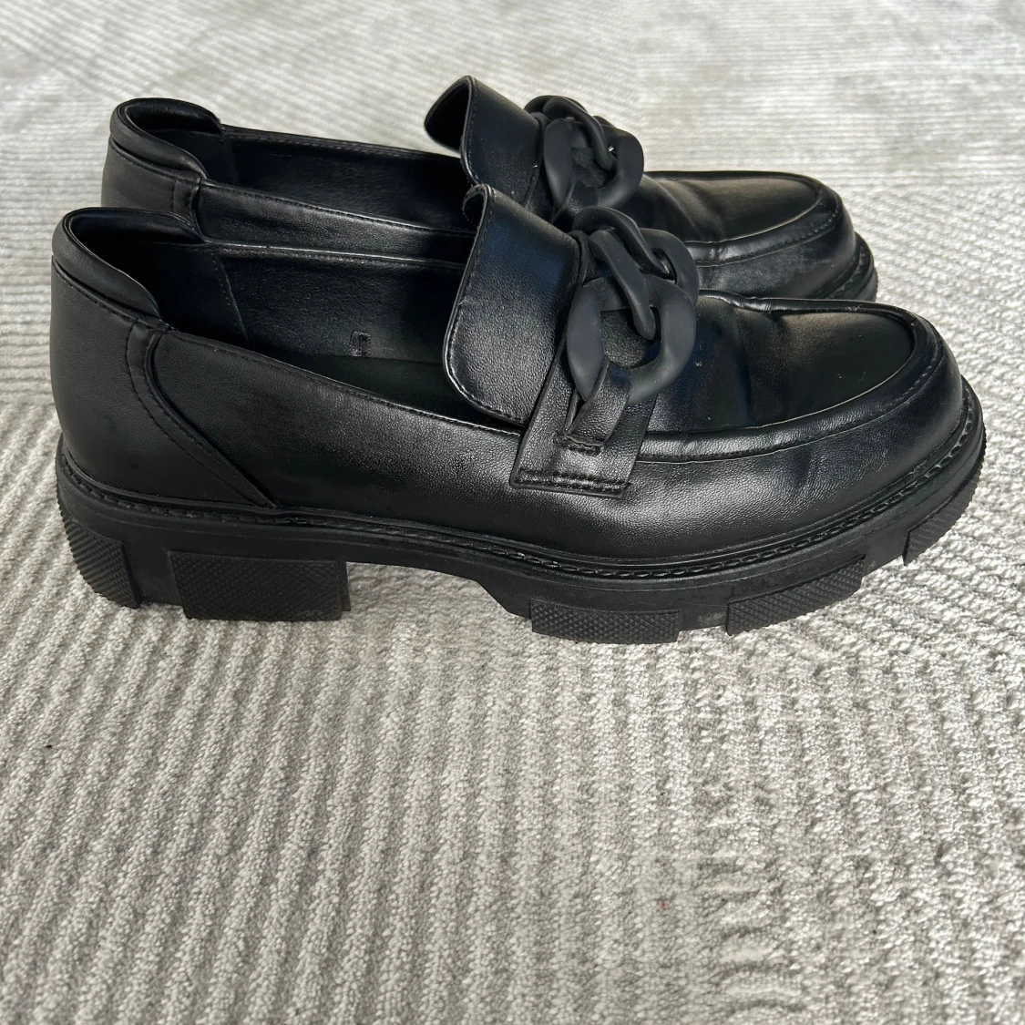 Säljer ett par chunky svarta loafers i skinnimitation med grov sula och en stor kedjedetalj framtill. Skorna har rund tå och platt sula, vilket ger en cool och trendig look. Perfekta för dig som vill sticka ut med dina skor.