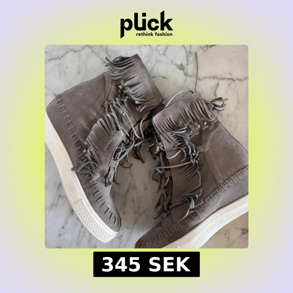 Säljer ett par grå boots i mocka med högt skaft och coola fransdetaljer runt hela skon. Skorna har snörning framtill och en vit platt sula som ger en snygg kontrast. Perfekta för dig som vill sticka ut med din stil! Kan sälja för billigare vi smidig affär