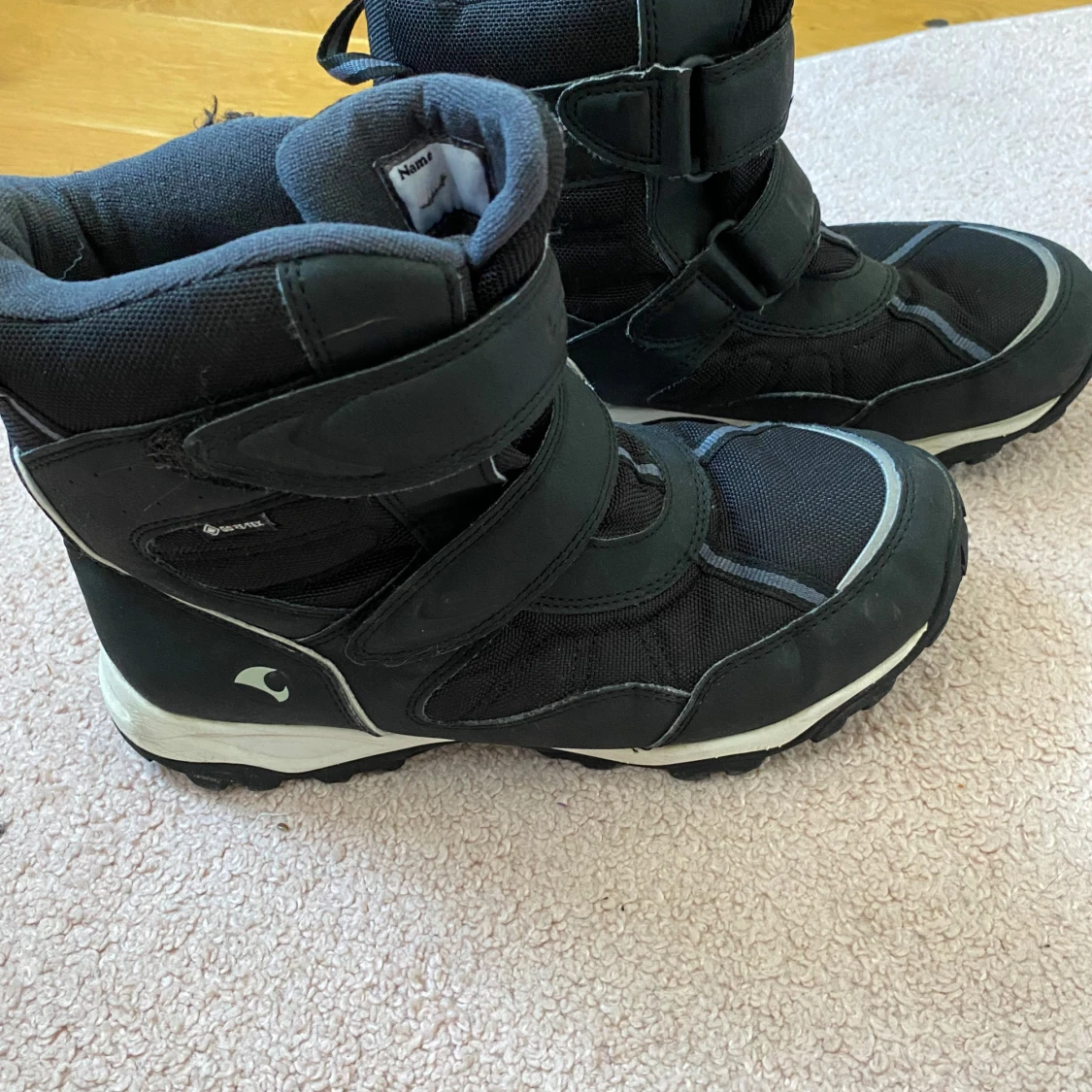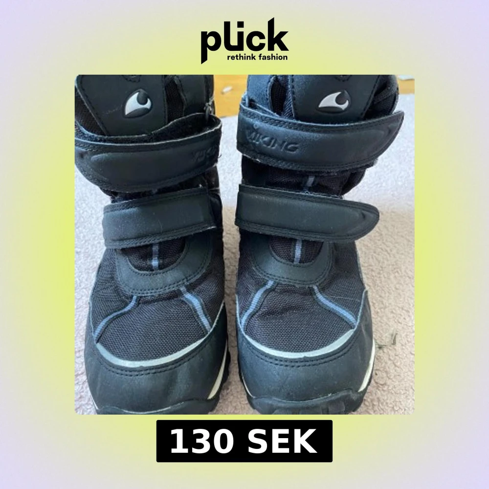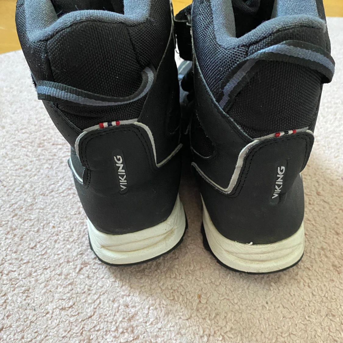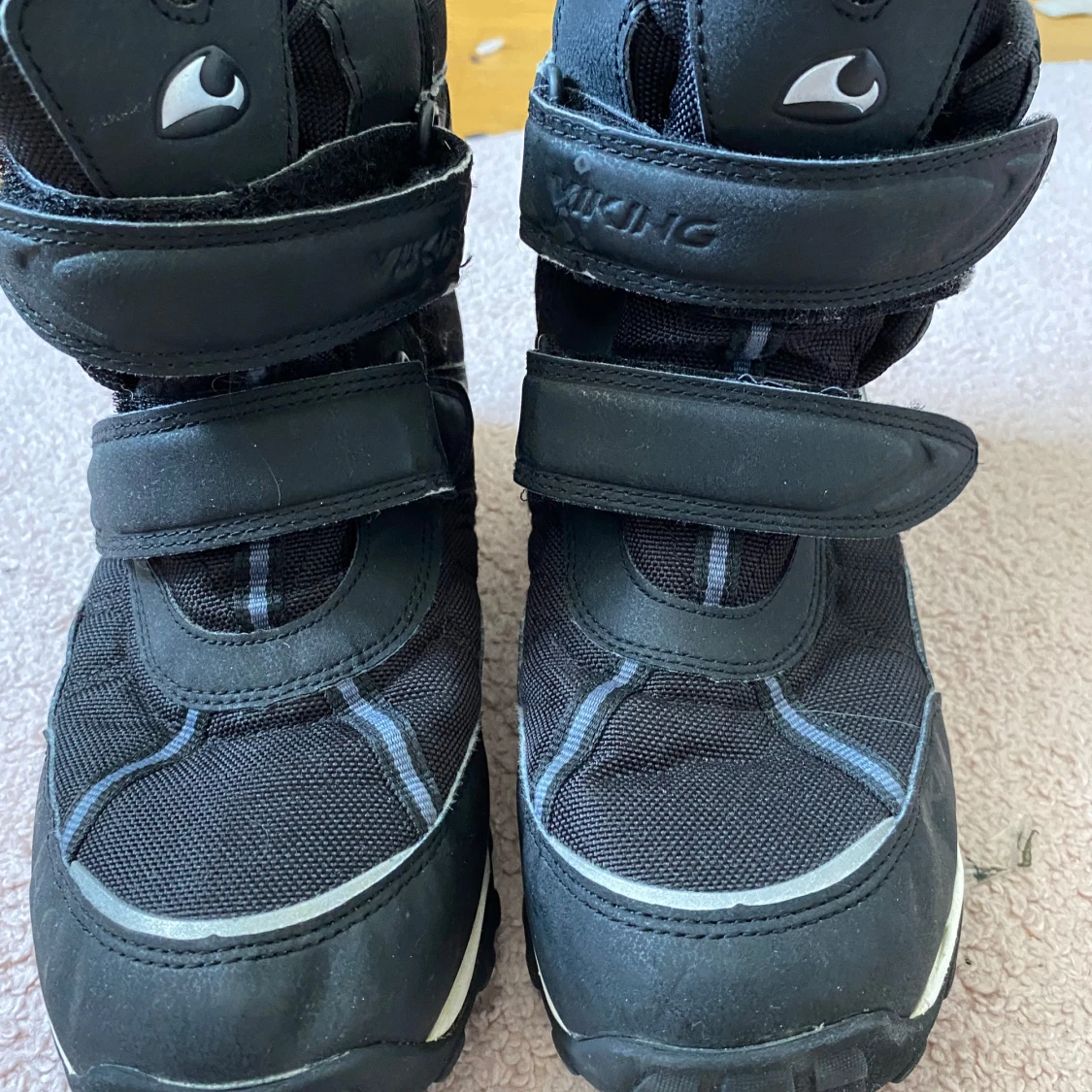 Svarta vinterkängor från Viking med två breda kardborreband för enkel påtagning. Grov sula för bra grepp och förstärkta partier runt tån och hälen. Skorna har diskreta grå detaljer och är tillverkade i syntetmaterial.