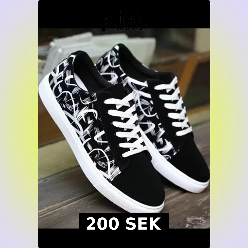 Svarta sneakers med vit graffiti-inspirerat mönster och vita snören. Skorna har en platt vit sula och rund tå. Materialet ser ut att vara syntet med textilinslag, vilket ger en cool och urban vibe. Perfekt för dig som gillar streetstyle och vill sticka ut.
