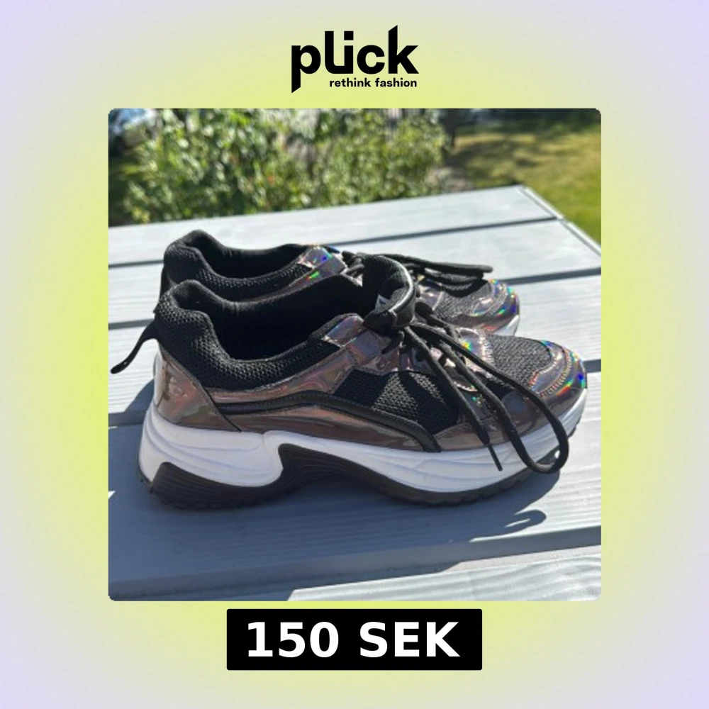 Snygga chunky sneakers i svart mesh med holografiska detaljer som skimrar i regnbågens färger. Skorna har tjock vit och svart sula, snörning och en sportig vibe. Perfekta för dig som vill sticka ut med coola och trendiga skor.