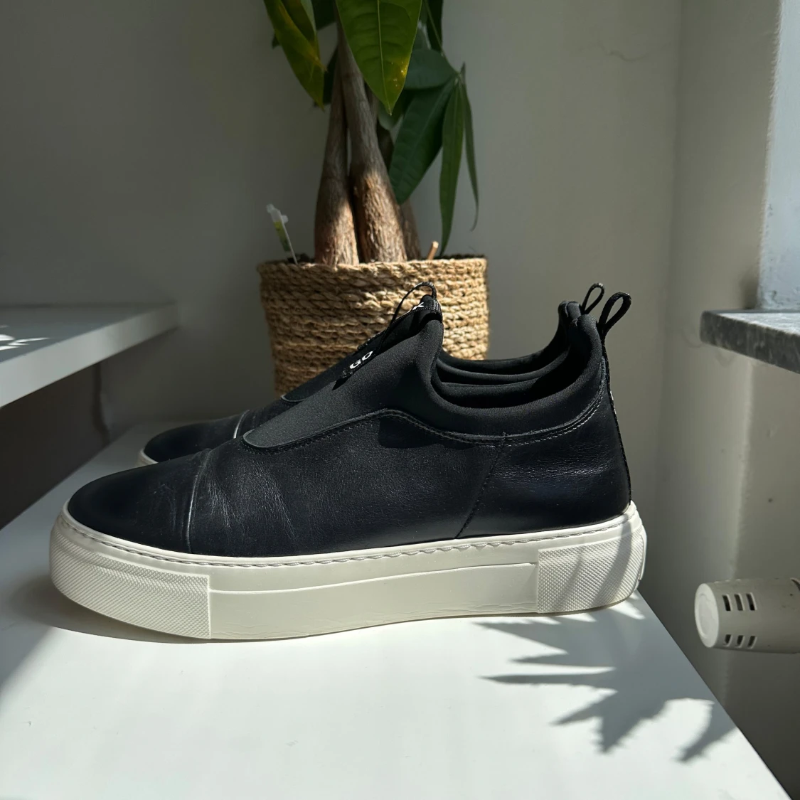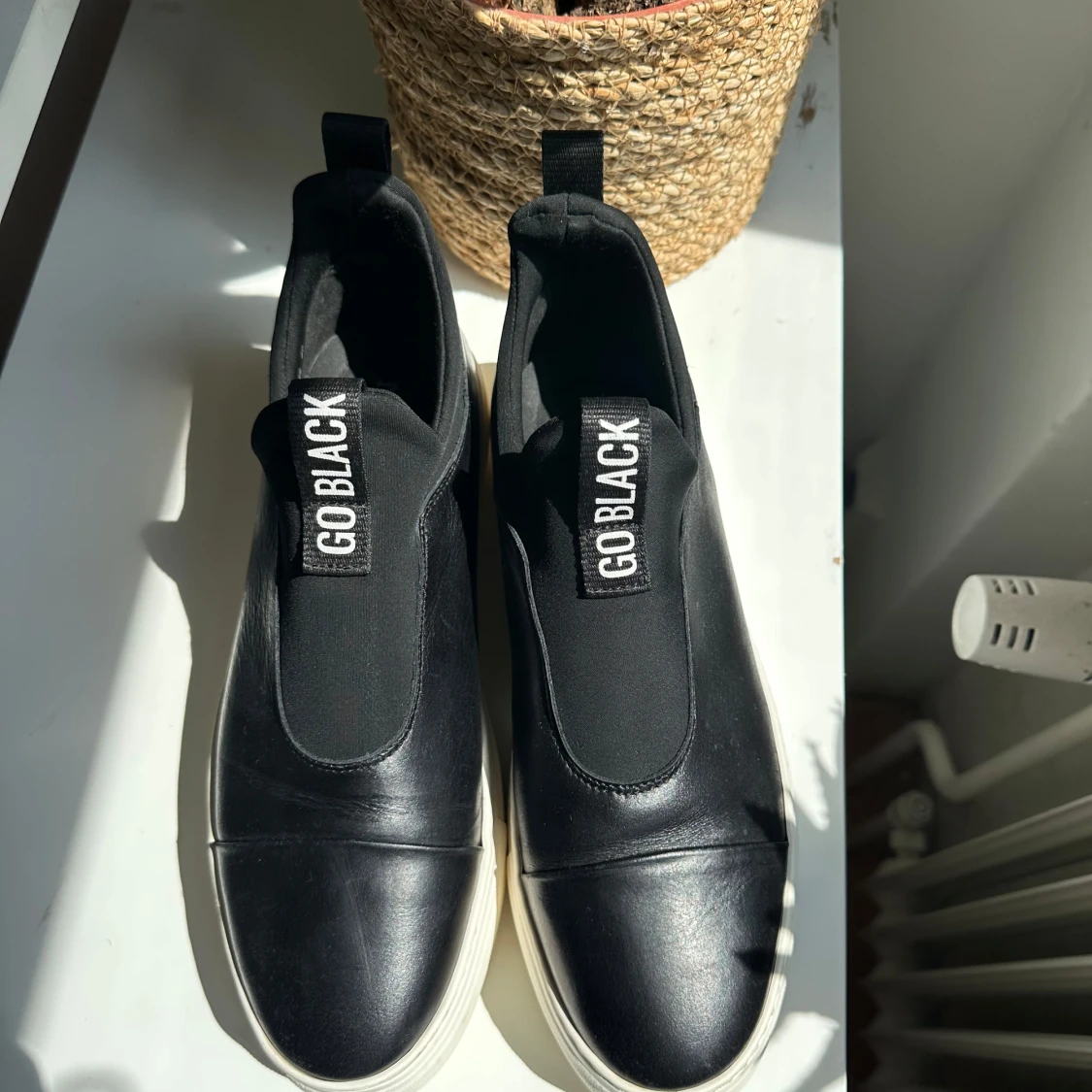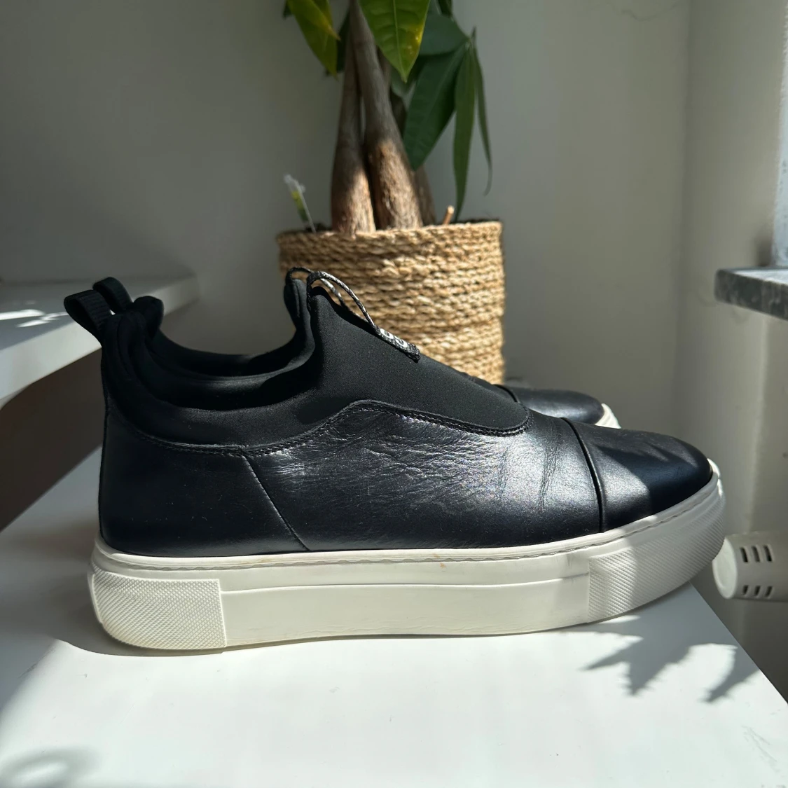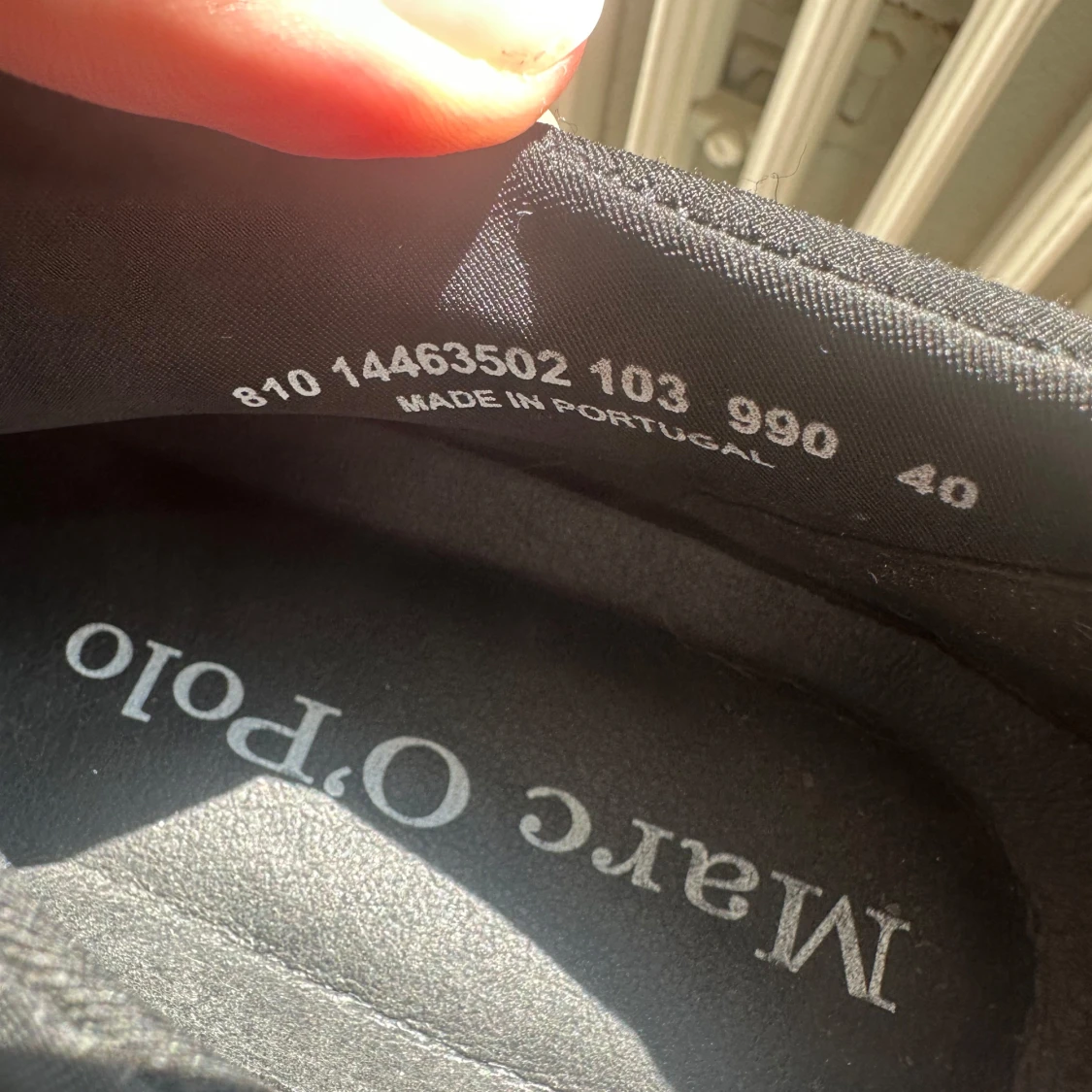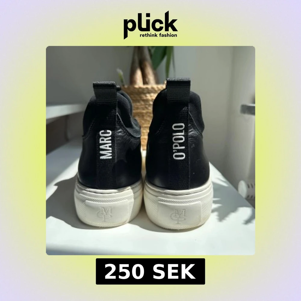 Stilrena och bekväma slip-on sneakers från Marco Polo i helsvart design. Skorna har en modern och minimalistisk look utan snörning (lace-less), vilket gör dem enkla att ta på och av – perfekta för både vardag och mer uppklädda tillfällen. De karaktäristiska Marco Polo-detaljerna ger en diskret touch av kvalitet och design. Skorna är i bra skick med inga större tecken på slitage. Inga hål, defekter eller andra skador – endast lätt använda och väl omhändertagna.