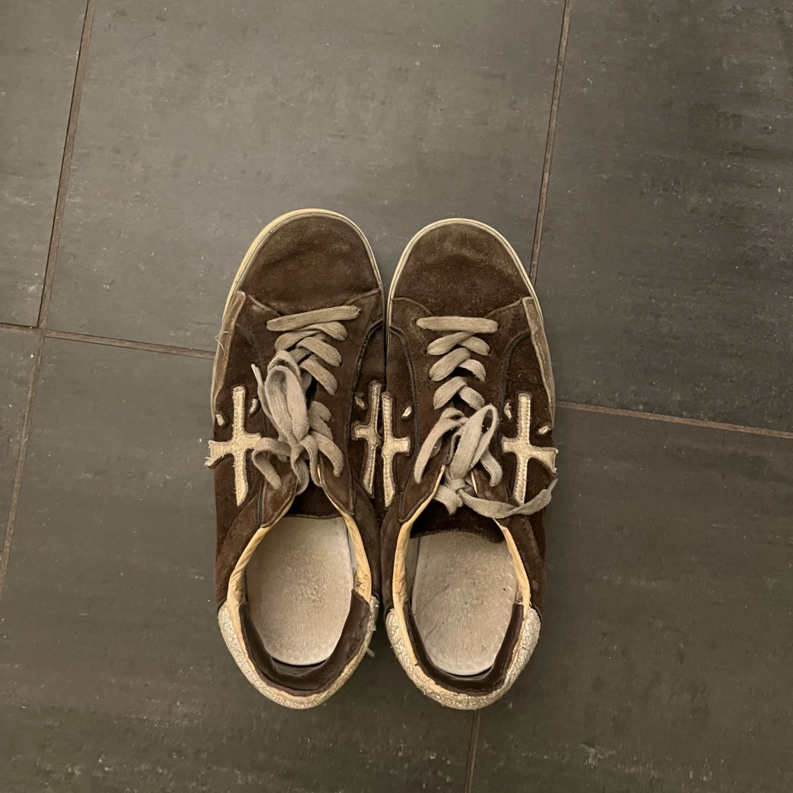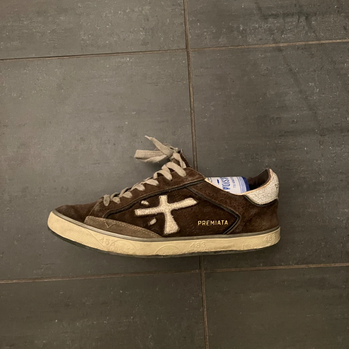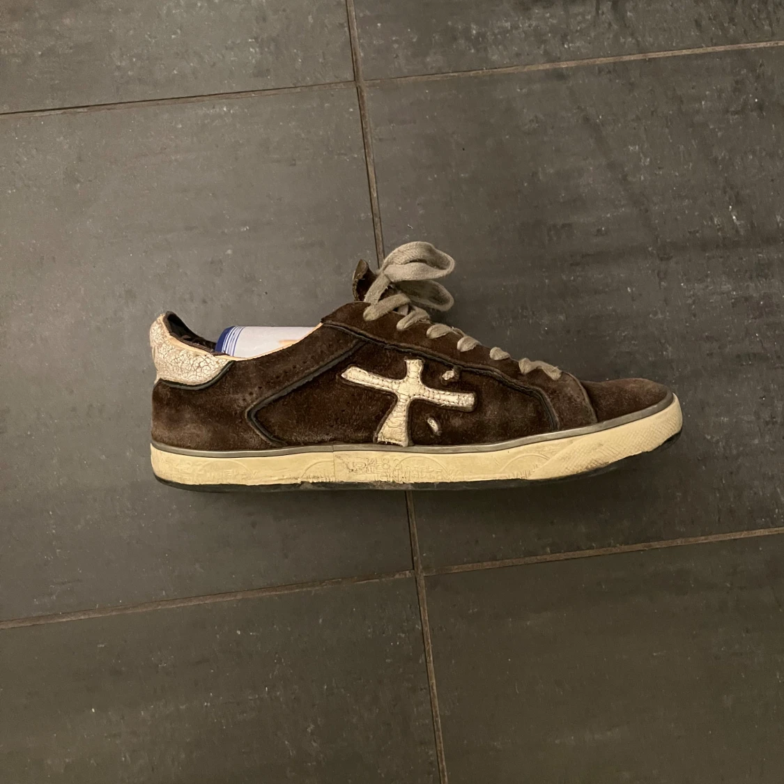 Säljer ett par bruna sneakers från Premiata med vit logga på sidan och detaljer i beige. Skorna har snörning och är tillverkade i mjuk mocka med en platt sula. Insidan och hälen har en ljusare, krackelerad look som ger extra karaktär. Perfekt för dig som gillar streetstyle. Sulan lagad nyligen!