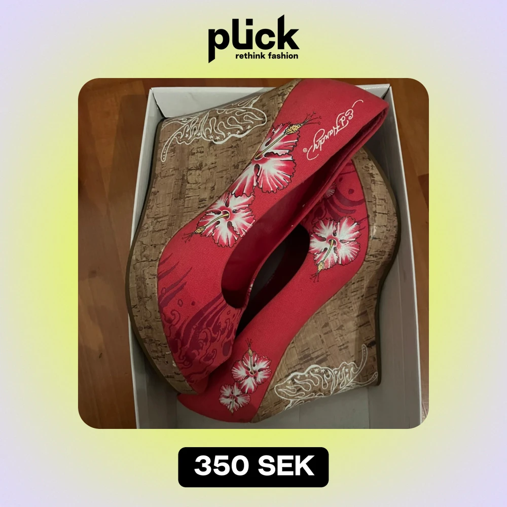 Säljer ett par unika rosa kilklackar från Ed Hardy med blommigt mönster. Skorna har en korkliknande sula och är dekorerade med vita och rosa blommor samt snygga detaljer på klacken. Perfekta för sommarens fester eller en dag när du vill sticka ut lite extra! 🌸
