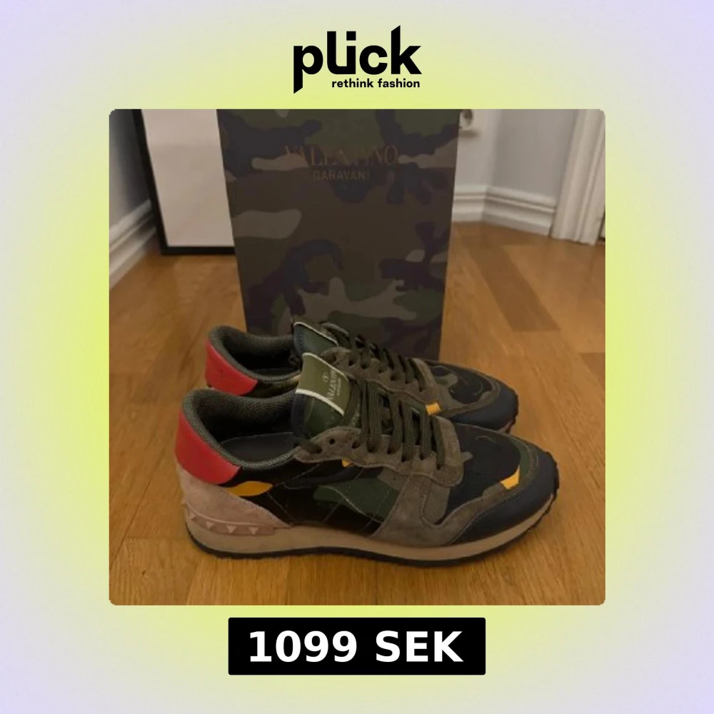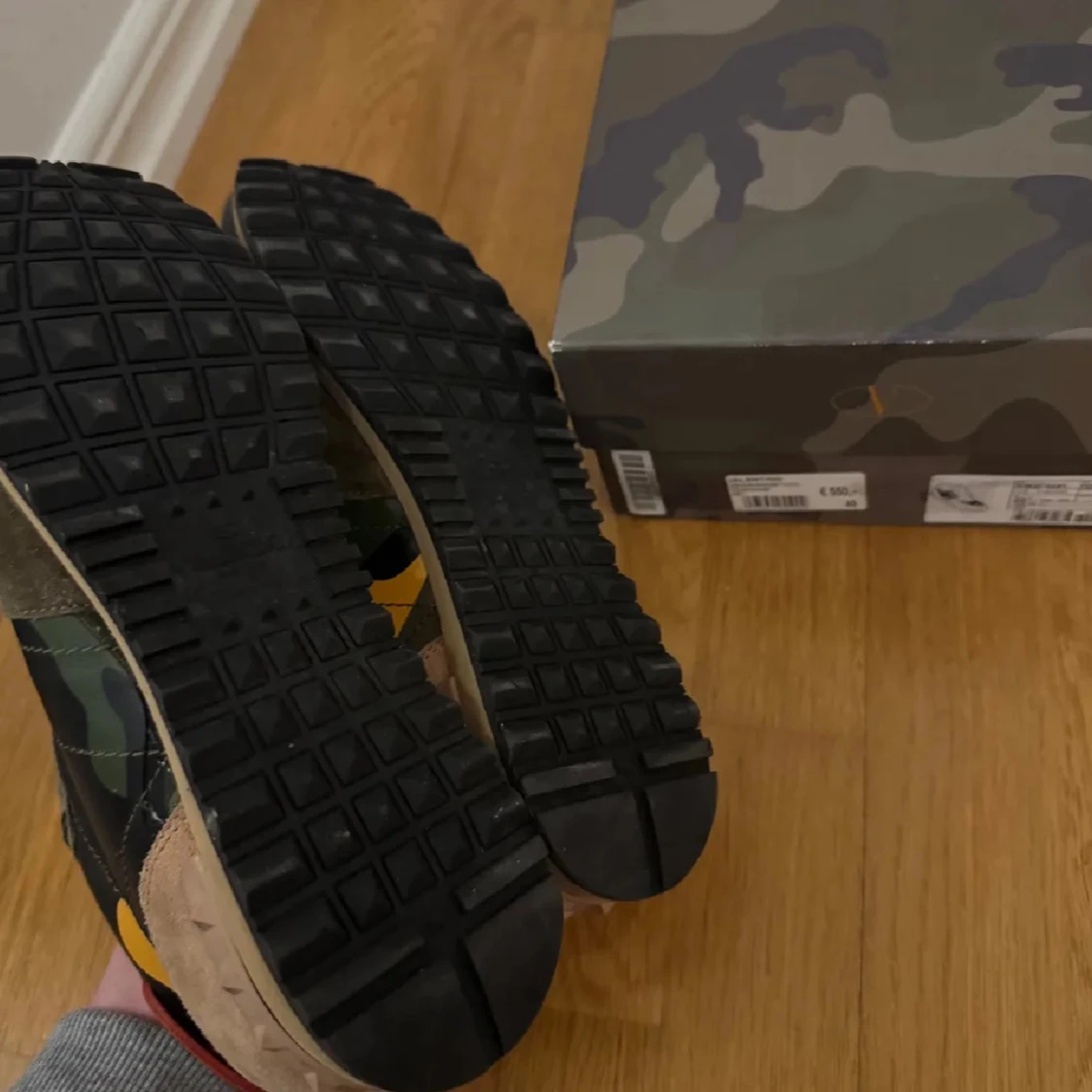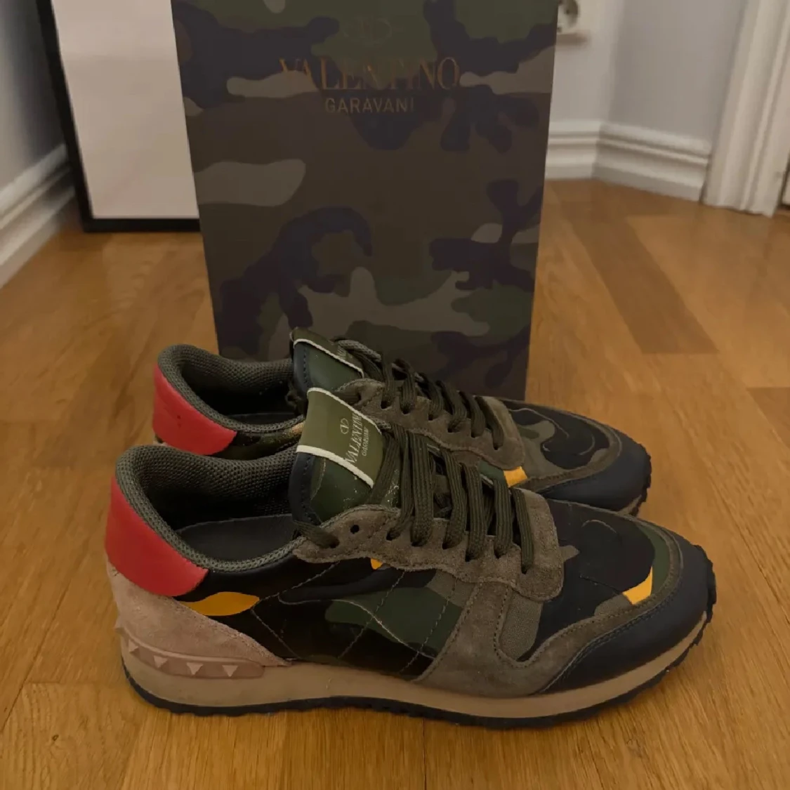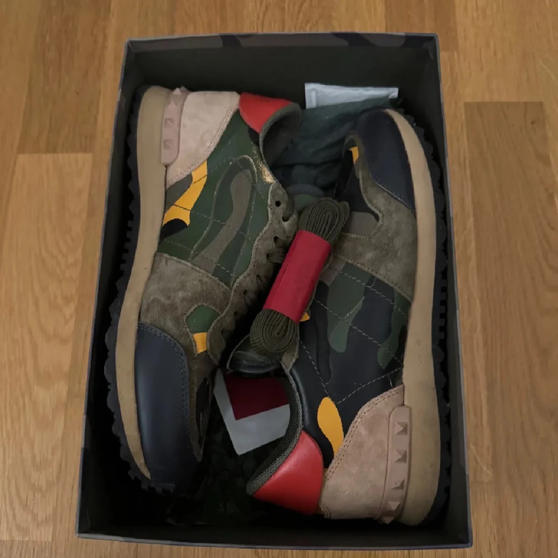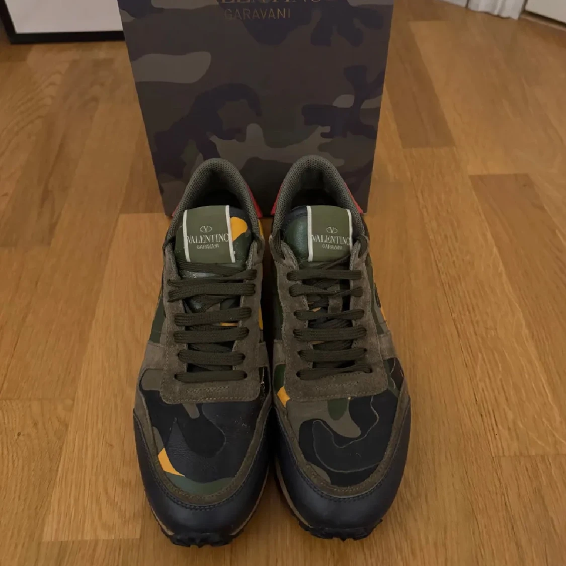 Snygga Valentino Rockrunner sneakers i ett coolt camouflage-mönster. Skorna har en mix av gröna, svarta och röda nyanser med detaljer i mocka och skinn. Perfekta för att ge din outfit en edgy touch.