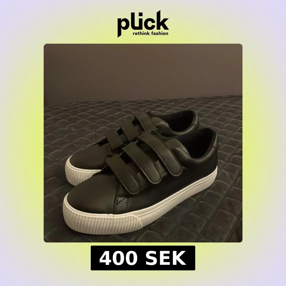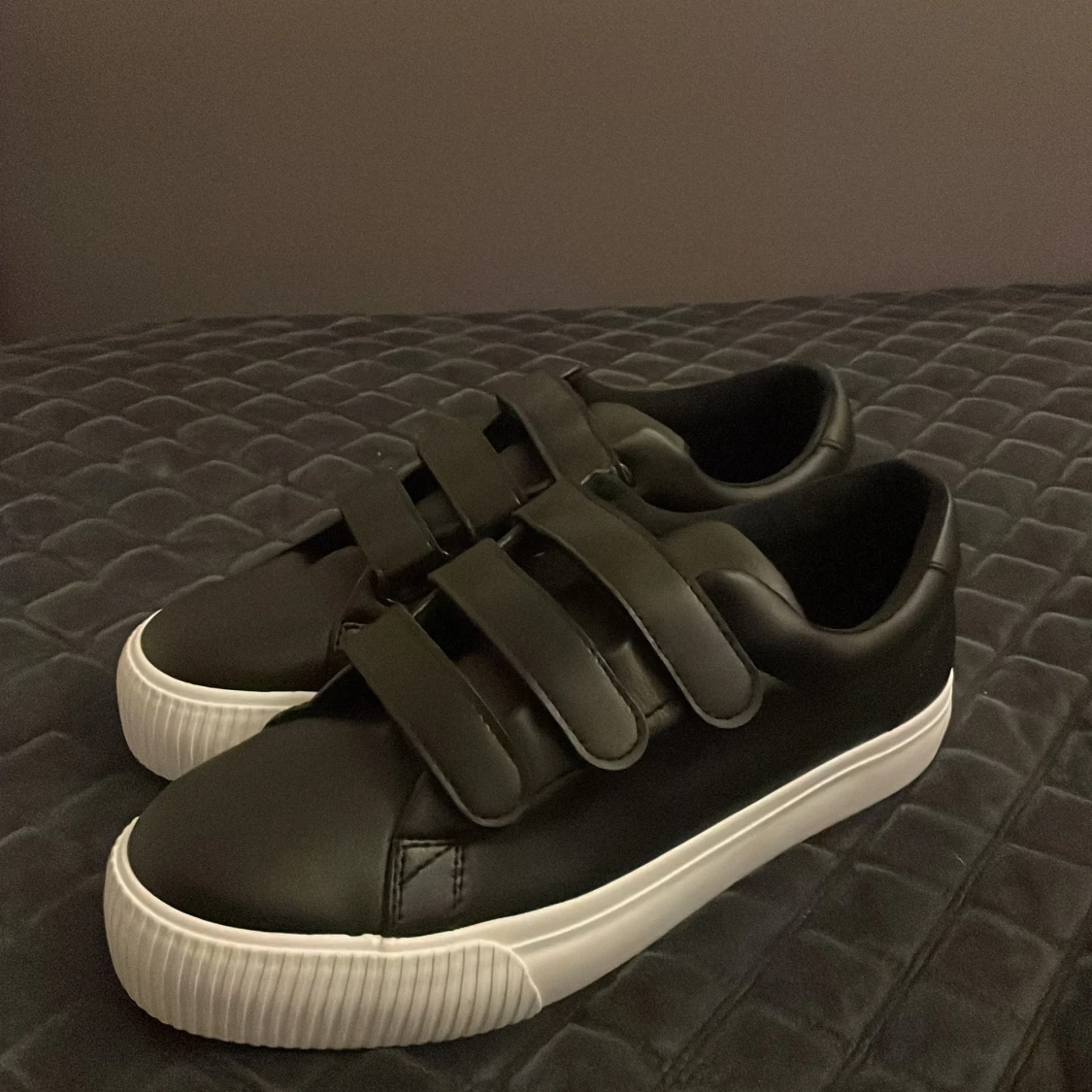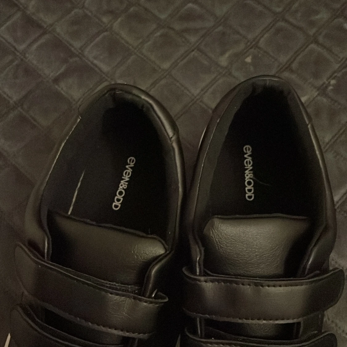 Snygga svarta sneakers från Even&Odd med tre breda kardborreband för enkel på- och avtagning. Skorna har en vit sula som ger en fräsch kontrast till det svarta syntetmaterialet. Perfekta för en stilren och bekväm look. Dom är helt oanvända beställde i fel storlek! Storlek 40