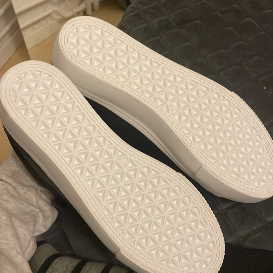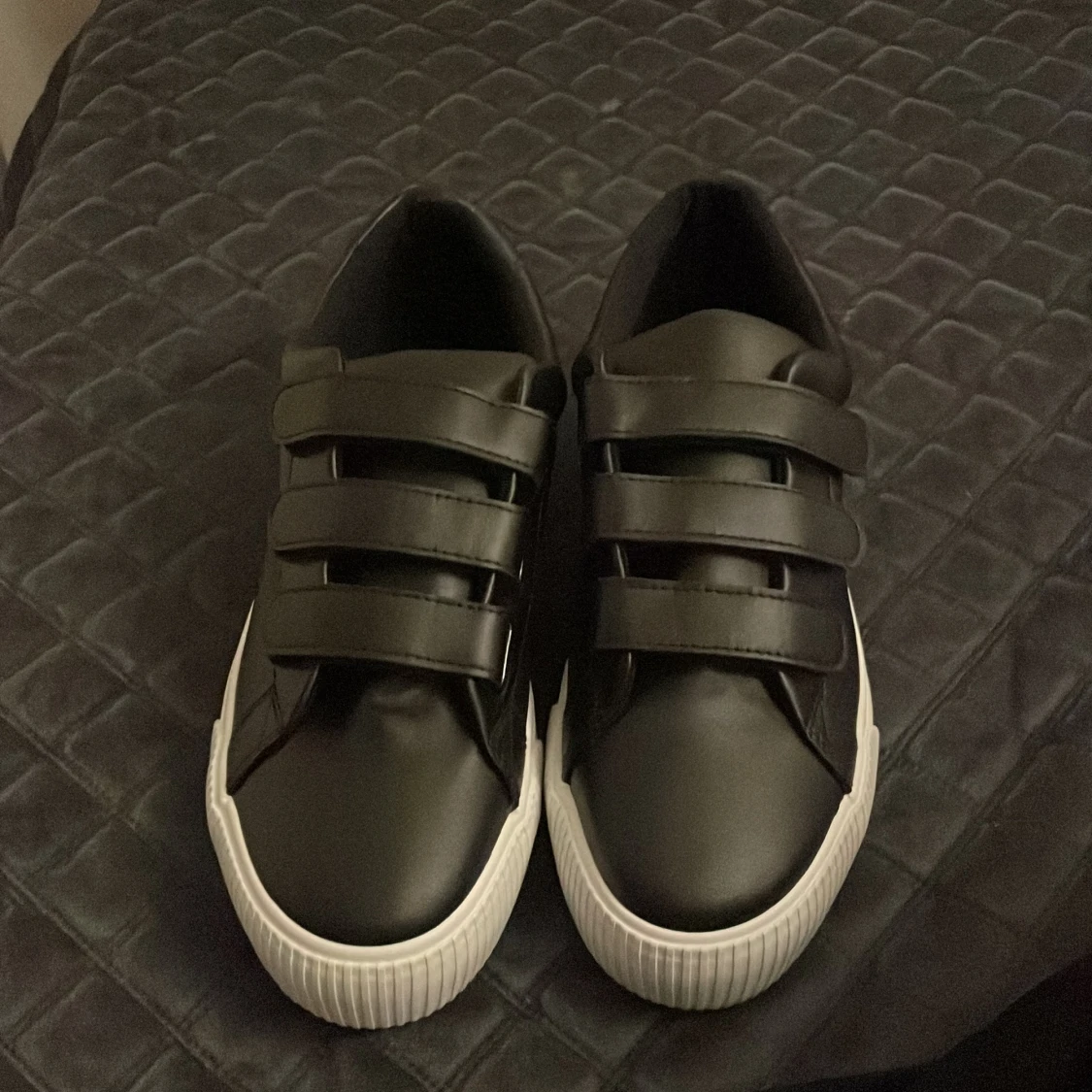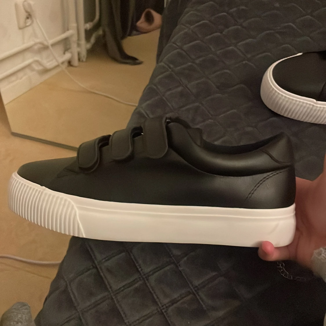 Snygga svarta sneakers från Even&Odd med tre breda kardborreband för enkel på- och avtagning. Skorna har en vit sula som ger en fräsch kontrast till det svarta syntetmaterialet. Perfekta för en stilren och bekväm look. Dom är helt oanvända beställde i fel storlek! Storlek 40