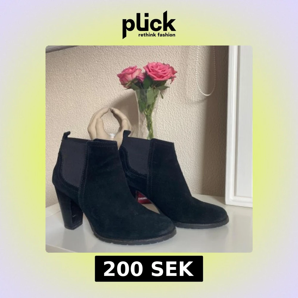 Snygga svarta chelsea boots i mocka med bred resår på sidorna och rejäl hög klack. Skorna har rund tå och en klassisk siluett som passar till många outfits. Perfekta för dig som vill ha en stilren och trendig look. Storlek 40