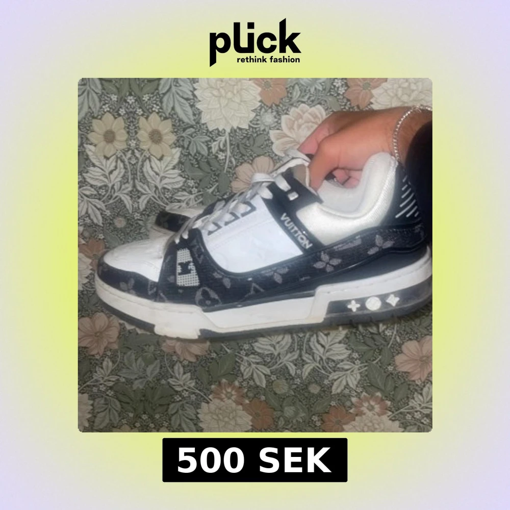 Säljer ett par snygga sneakers från Vuitton i vitt och svart med coola detaljer och mönster på sidorna. Skorna har snörning och en platt sula, perfekta för en trendig streetstyle-look.