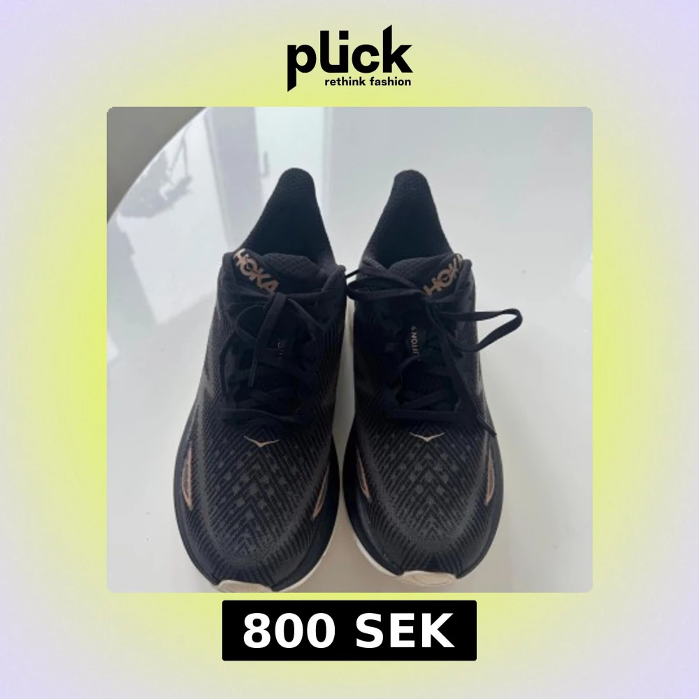 Säljer ett par svarta Hoka Clifton 9 sneakers med rosa detaljer och vit sula. Skorna har snörning och är tillverkade i ett ventilerande syntetmaterial med mönstrad ovandel. Perfekta för dig som gillar att springa eller promenera långt.