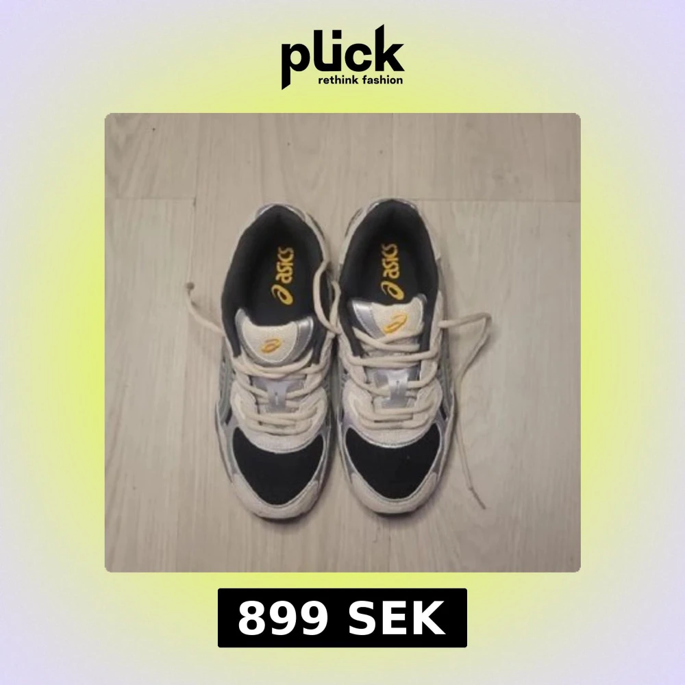 Säljer ett par snygga Asics sneakers i svart, silver och vitt med gula detaljer. Skorna har klassisk snörning, rund tå och en chunky sula som ger grym komfort. Perfekta för dig som gillar sportig stil och vill ha något som sticker ut lite extra.