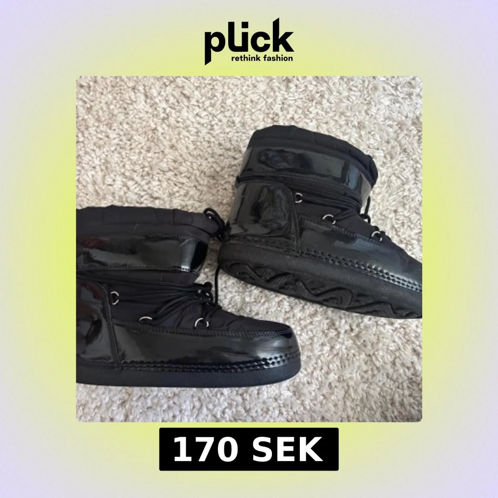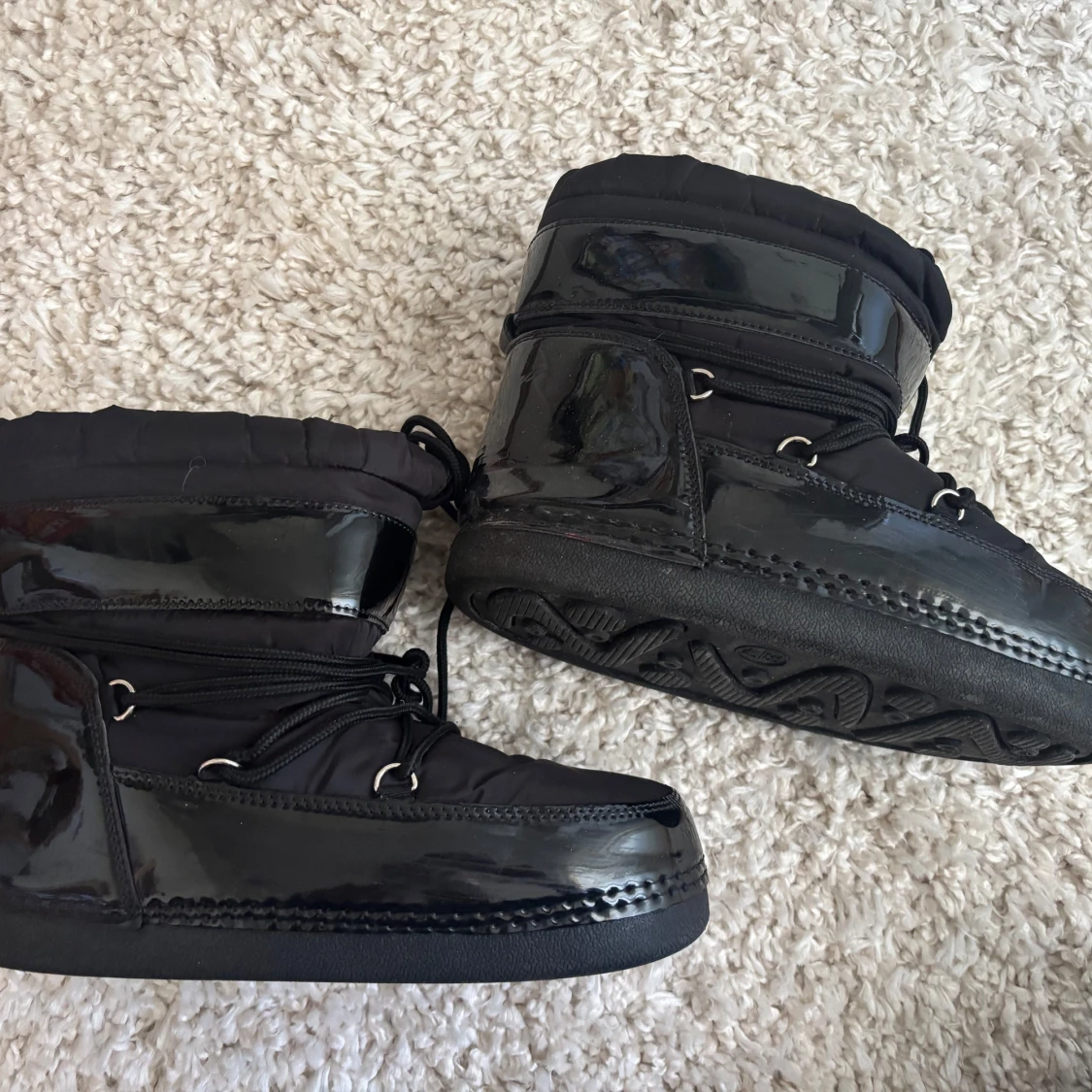 Säljer ett par svarta moon boots med glansiga detaljer och snörning framtill. Skorna har en rund tå och platt sula, perfekta för kalla dagar. De är tillverkade i syntetmaterial och har en modern look.