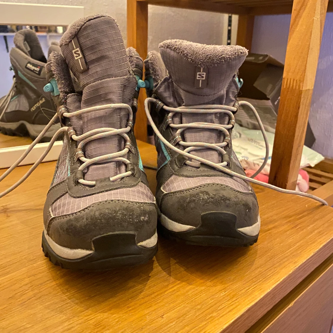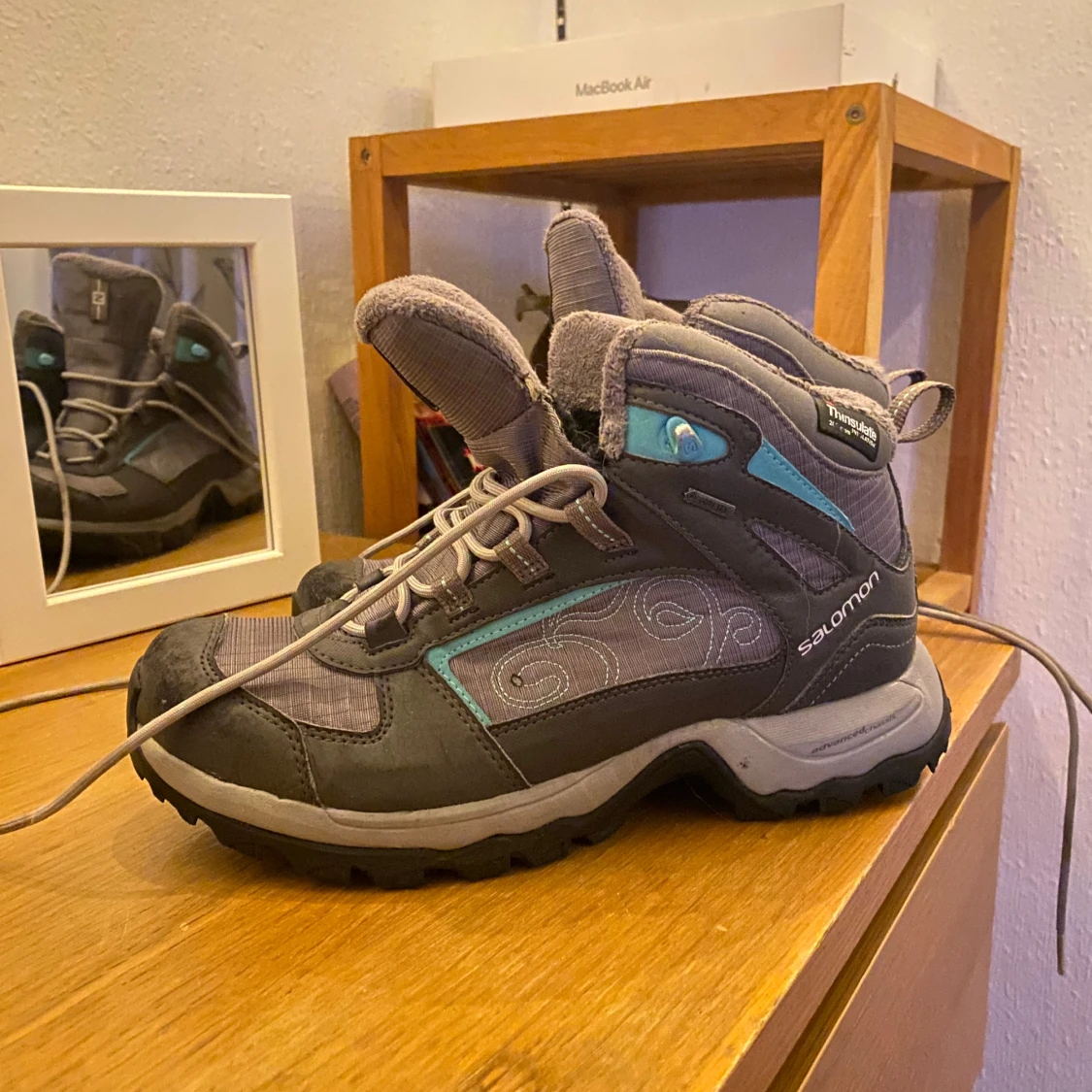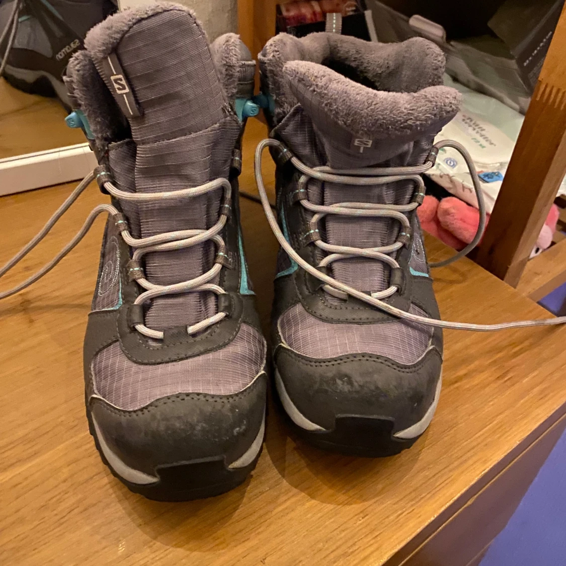 Säljer ett par gråa Salomon vinterkängor med Thinsulate-foder och snygga turkosa detaljer. Kängorna har snörning, grov sula och är tillverkade i syntet och textil. Perfekta för kalla dagar och outdoor-äventyr. Mönstrad sida för extra stilpoäng.