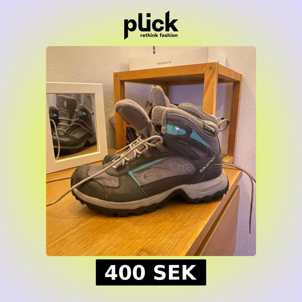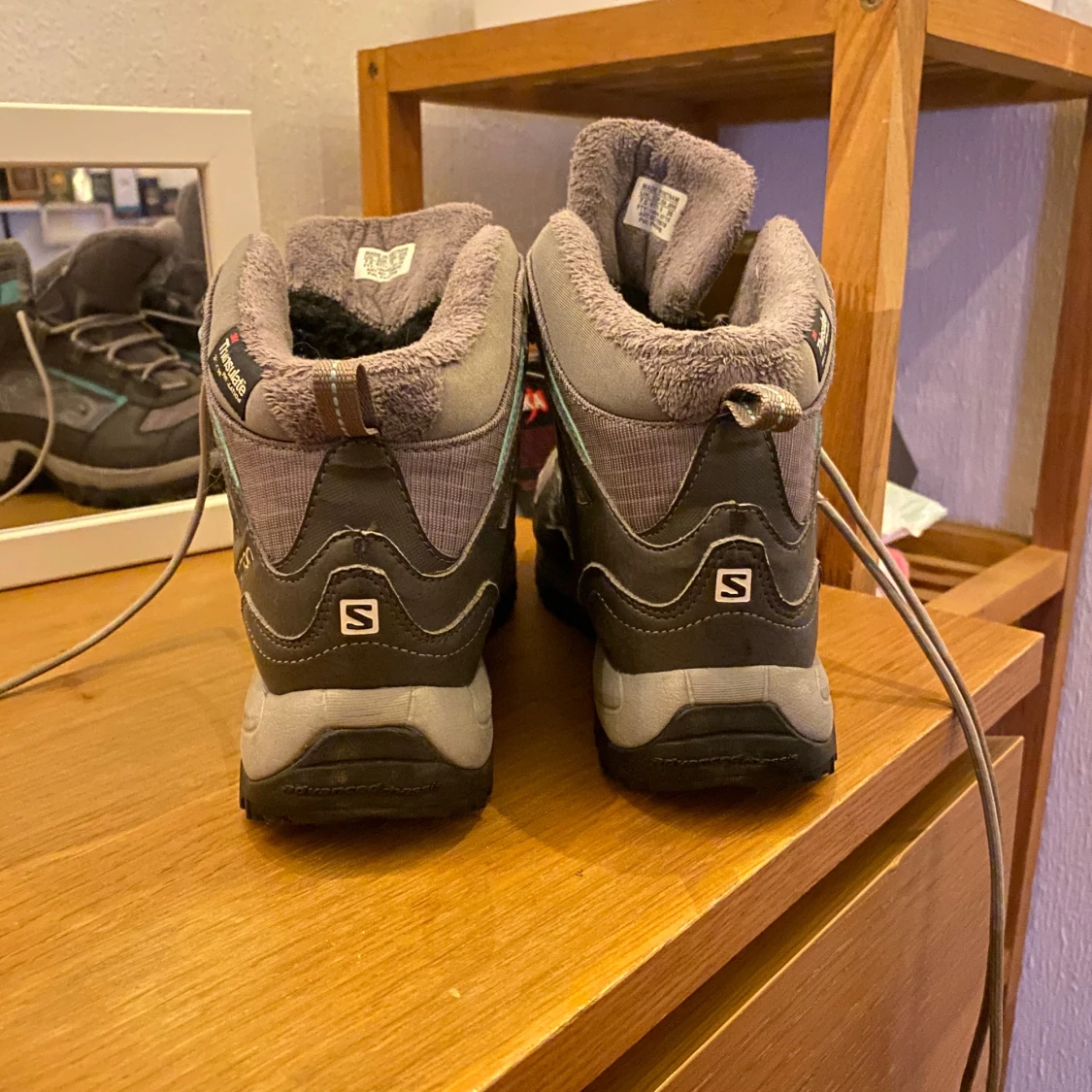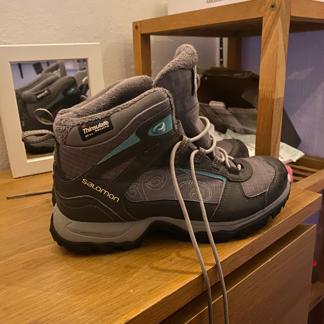 Säljer ett par gråa Salomon vinterkängor med Thinsulate-foder och snygga turkosa detaljer. Kängorna har snörning, grov sula och är tillverkade i syntet och textil. Perfekta för kalla dagar och outdoor-äventyr. Mönstrad sida för extra stilpoäng.