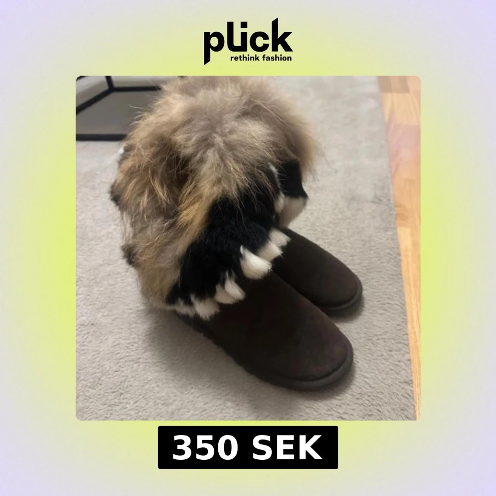 Unika bruna boots med rund tå och platt sula, dekorerade med tjock, flerfärgad päls i beige, svart och vit. Perfekta för dig som vill sticka ut och hålla dig varm under vintern. Materialet är mocka och päls, och de har en riktigt cozy vibe. Finns liten fläck från snö