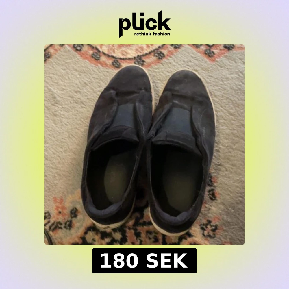 Svarta slip-on sneakers med vit sula, tillverkade i mocka och syntet. Skorna har en rund tå och platt sula, med elastiska paneler på ovansidan för enkel på- och avtagning. Perfekt för dig som gillar enkel och stilren design inte jätte bra skick men funkar att ha