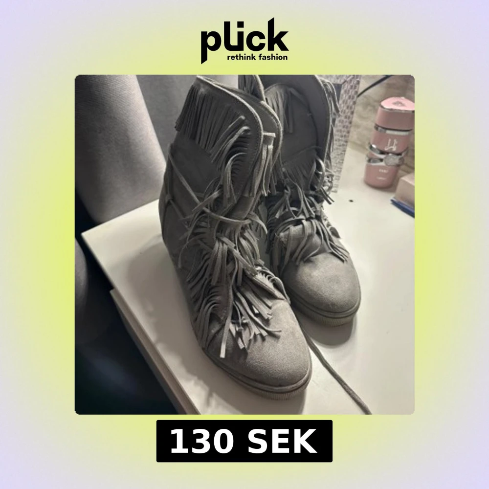 Säljer ett par grå boots i mocka med massor av fransdetaljer längs skaftet och framtill. Skorna har rund tå, platt sula och snörning. Perfekta för dig som vill sticka ut med en cool och bohemisk stil.