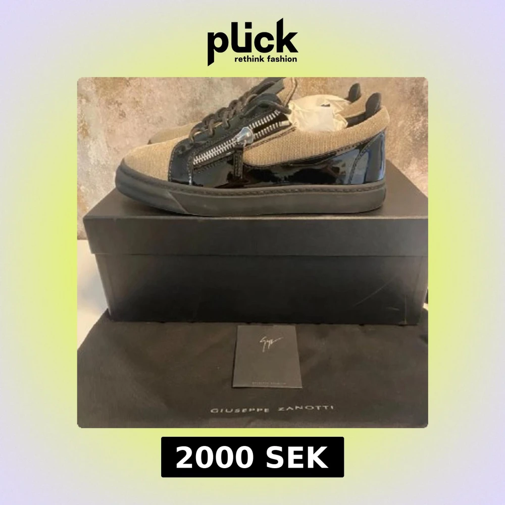 Snygga sneakers från Giuseppe Zanotti i beige textil och svart lackdetalj. Skorna har svarta snören, dragkedjor på sidorna och en robust svart sula. Perfekt för dig som gillar exklusiv och modern streetstyle.