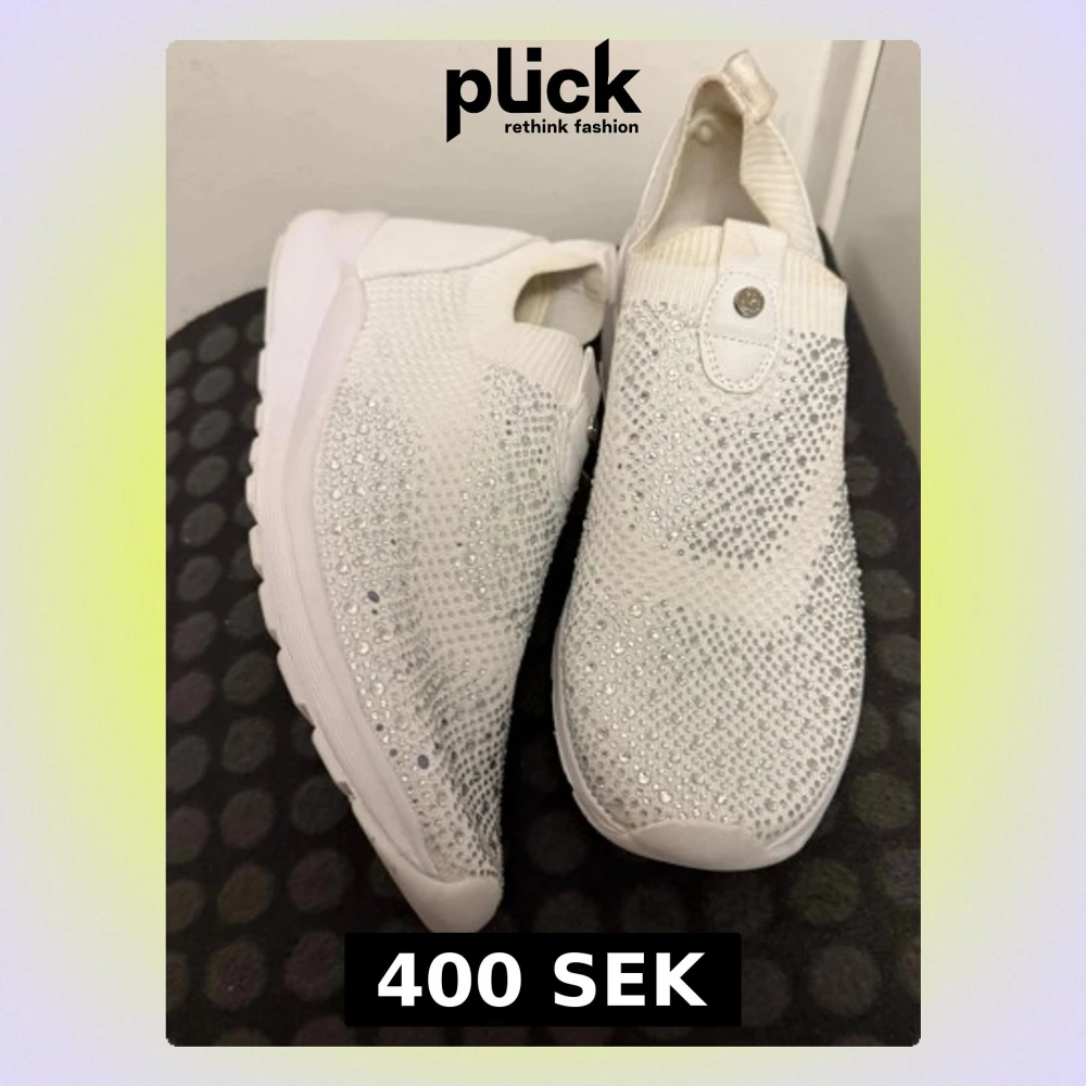 Säljer ett par vita sneakers med glittriga stenar över hela ovandelen. Skorna har en stickad ovandel i syntetmaterial och en tjock, vit platt sula. De är slip-on och har en modern, sportig look med extra bling.