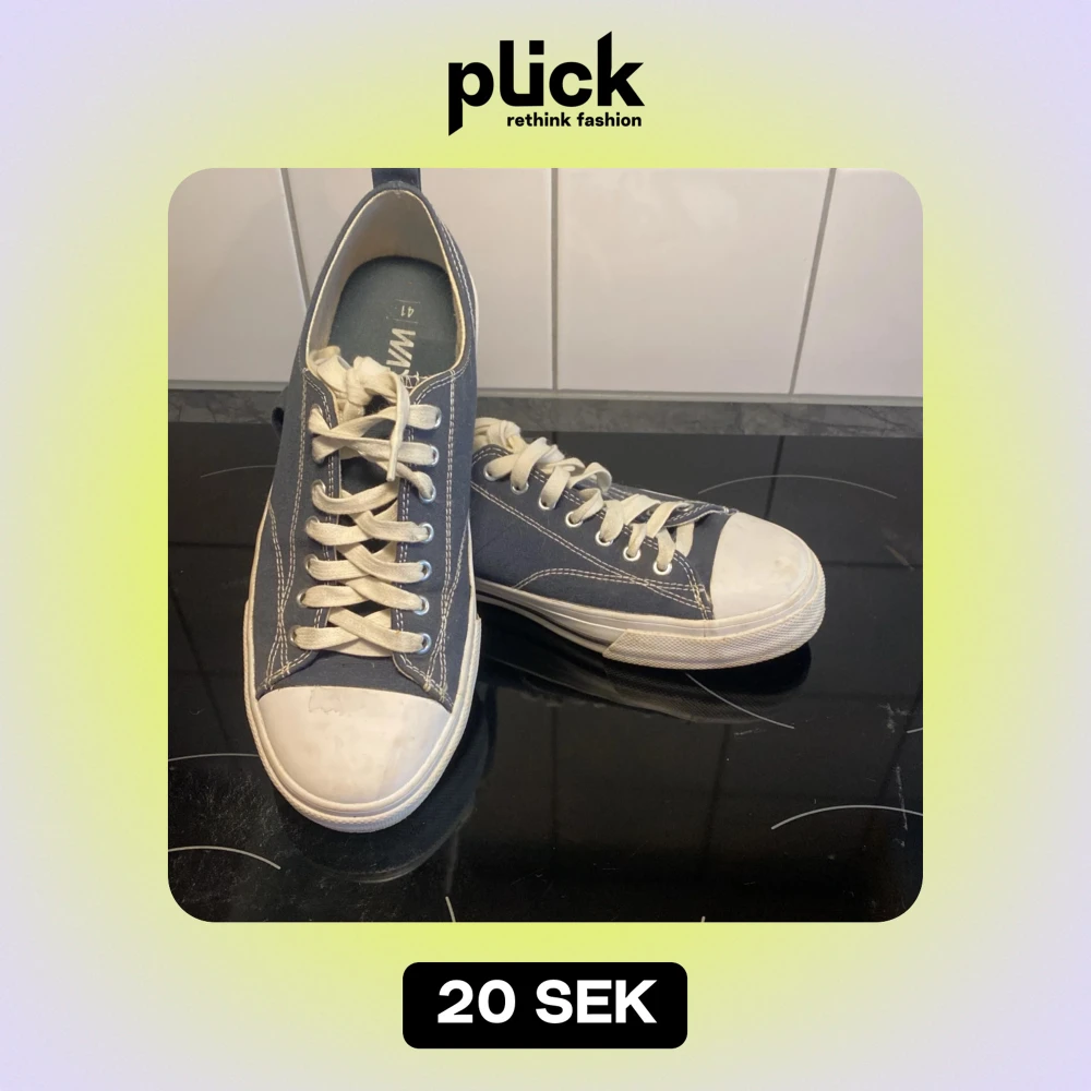 Säljer ett par blå sneakers från Warp i storlek 41. De har vita snören och en vit sula som ger en klassisk look. Perfekta för vardagsbruk och passar till det mesta. Lite använda men i bra skick!