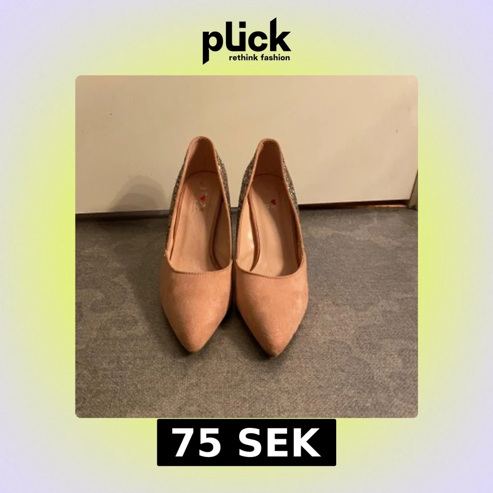 Snygga pumps i beige mockaliknande material framtill och med glittrig baksida och klack. Skorna har spetsig tå och hög klack, perfekta för att sticka ut. Glittret på baksidan ger en extra festlig touch.Passar perfekt för en ute kväll med kompisarna 🥳🎉🪩