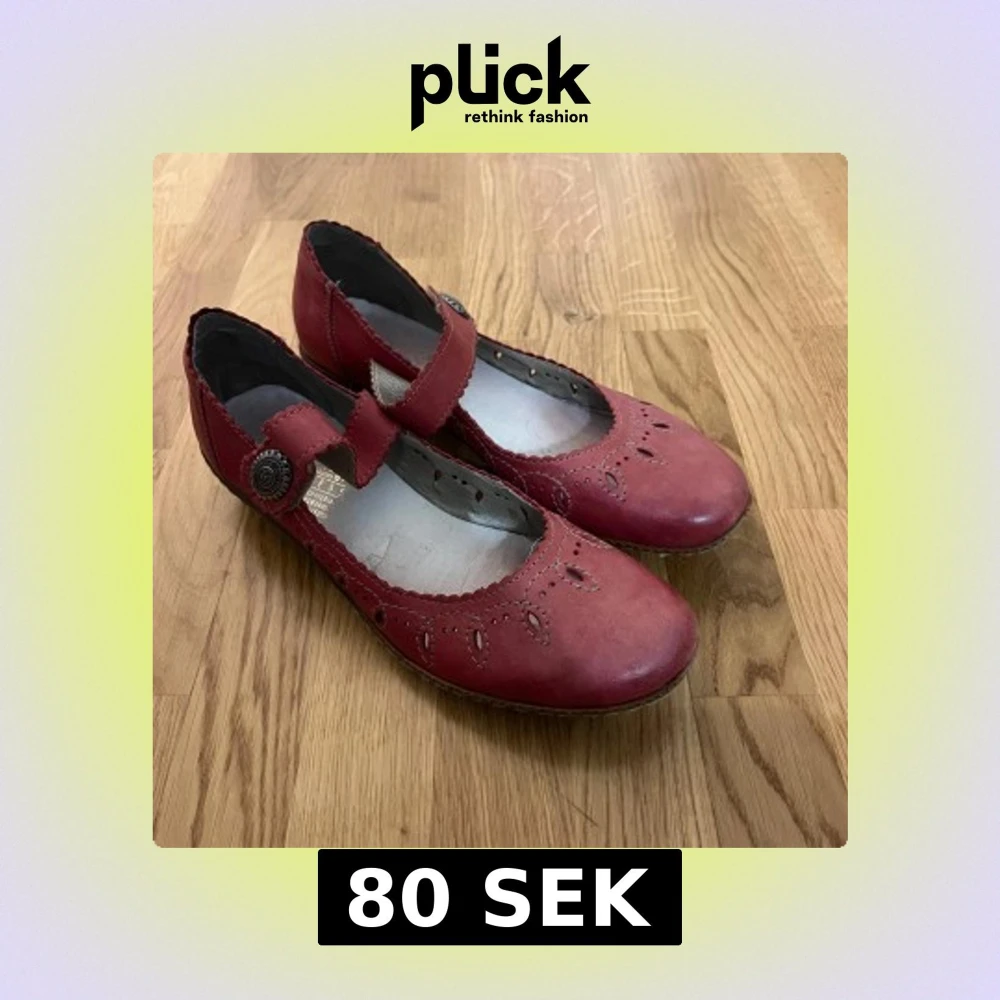 Snygga röda ballerinaskor från Rieker i skinn med dekorativa broderier och rem med knappdetalj. Rund tå och låg klack ger en klassisk look. Perfekta för dig som vill ha något unikt och bekvämt till vardags. Säljer pga att de är för stora! De är jättefina och passar till nästan allt plus att det är äkta skinn . OBS! Köparen står för frakt!