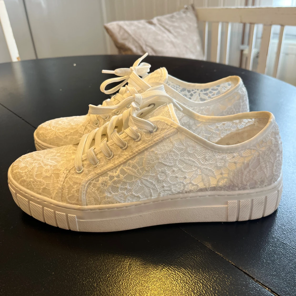 Snygga vita sneakers med blommig spets över hela skon och vita snören. Skorna har en platt sula och rund tå, vilket ger en fräsch och trendig look. Perfekta för dig som vill ha något unikt och stilrent till din outfit.Är använda 1 gång.De ser mer beige ut på bilden pga ljuset, men är vita!!