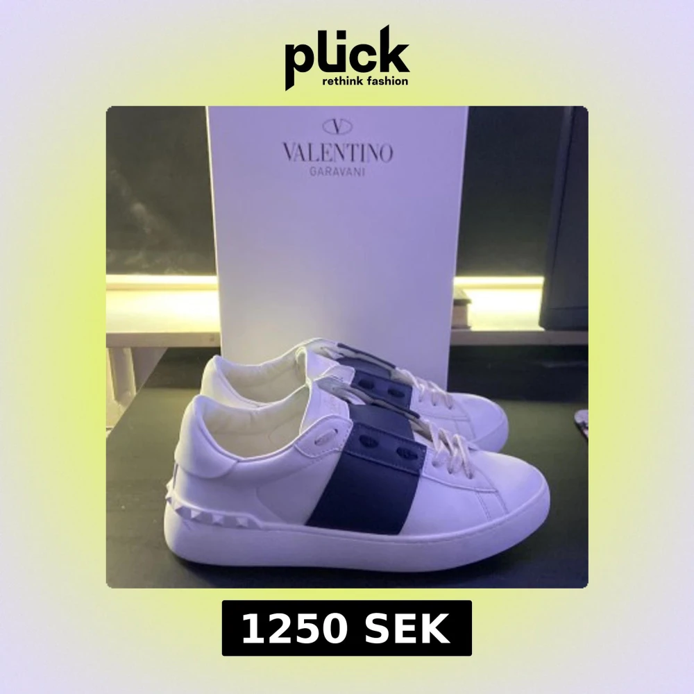 Snygga Valentino Garavani sneakers i vitt med en bred blå rem över ovansidan. Skorna har en stilren design med snörning och dekorativa nitar på hälen. Perfekta för en trendig look. Vet inte om de e riktig, därför säljer så billigt. Skriv gärna om ni har frågor! OBS: Box och dustbag medföljer!