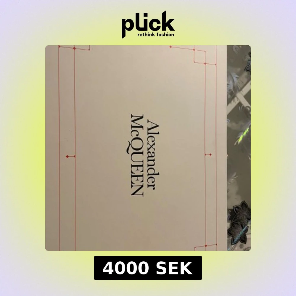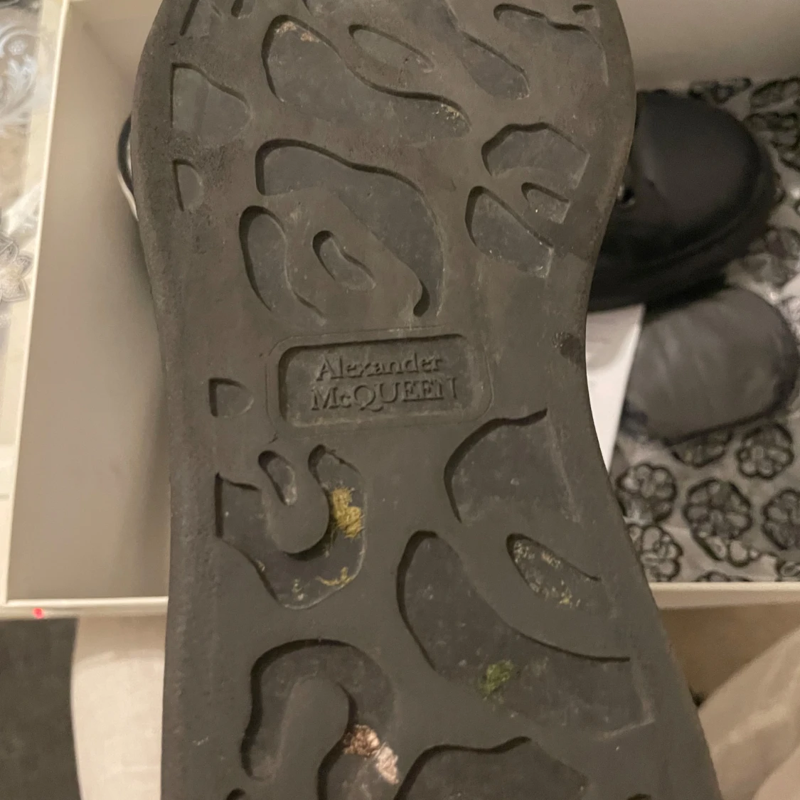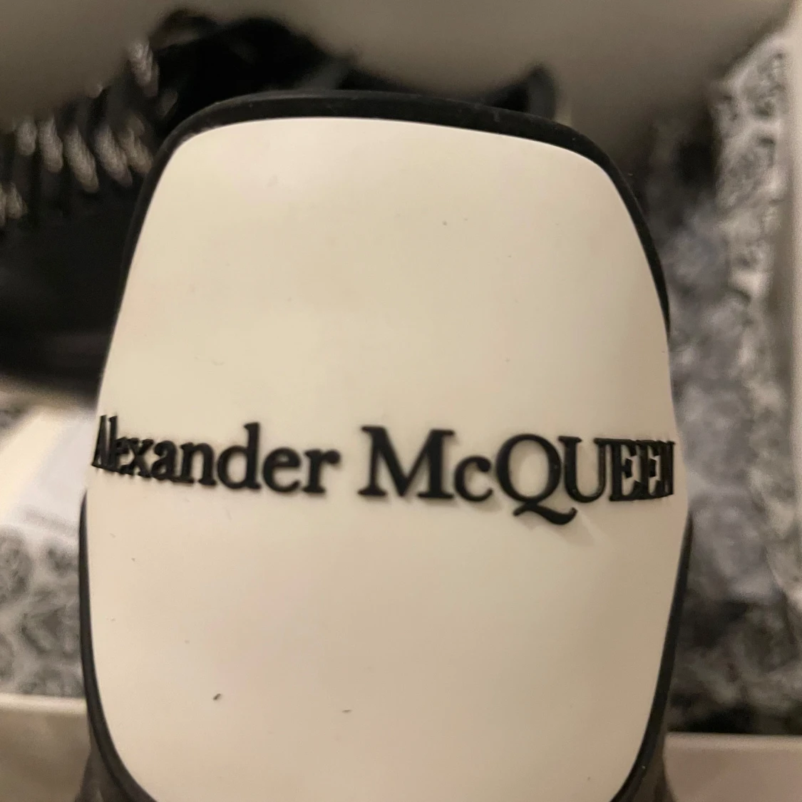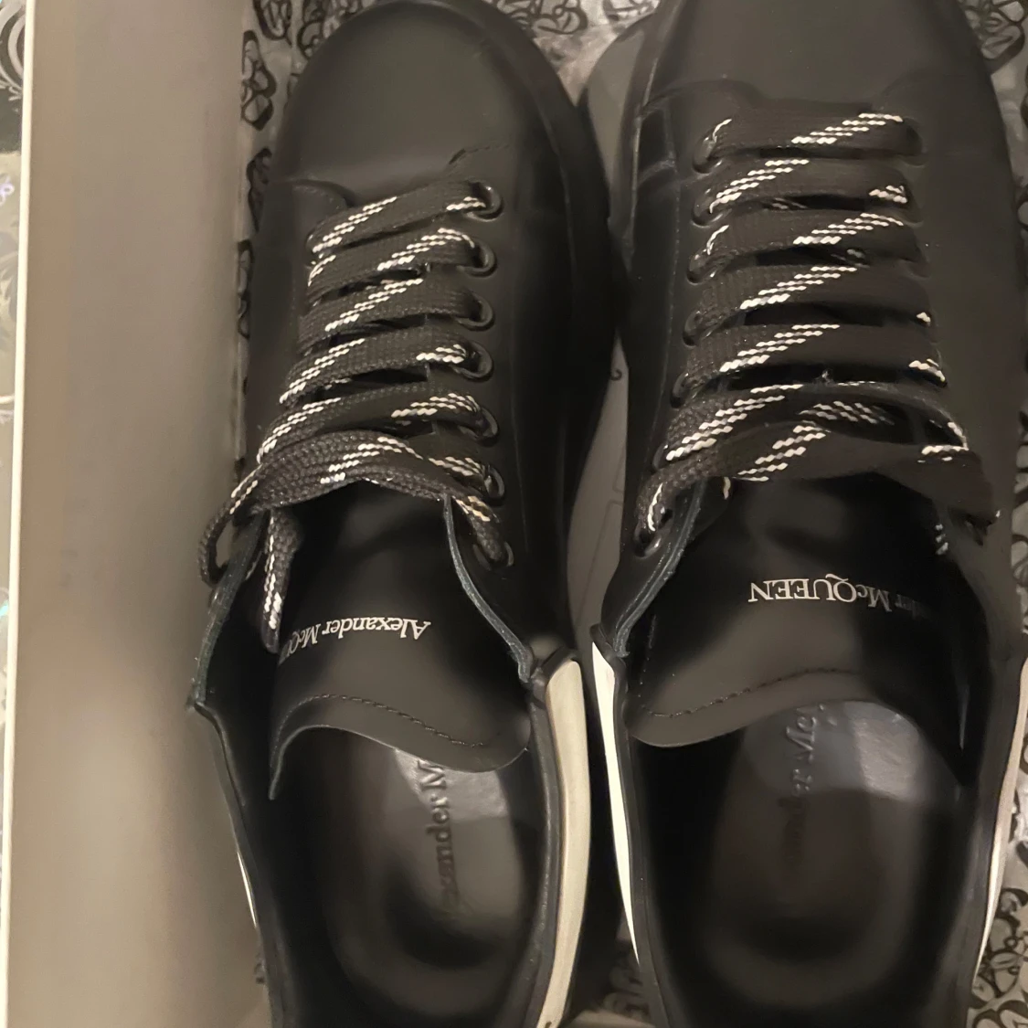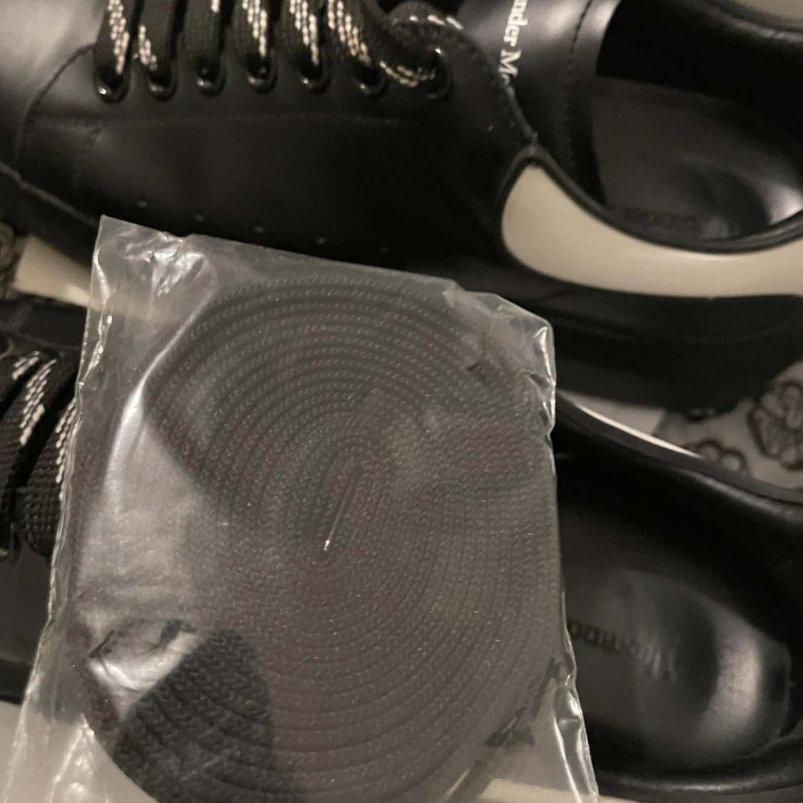 Stilrena svarta sneakers från Alexander McQueen med vita detaljer och logga på hälen. Skorna har tjock sula, rund tå och breda snören med svartvitt mönster. Tillverkade i skinn för en lyxig känsla och passar perfekt till en trendig streetwear-look. Kvitto och box finns, säljer för använder inte dem. Storlek